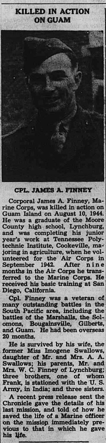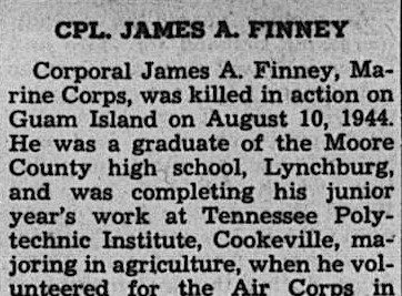 Corporal James A. Finney, Marine Corps, was killed in action on Guam Island on August 10, 1944. He was a graduate of the Moore County high school, Lynchburg, and was completing his junior year’s work at Tennessee Polytechnic Institiute, Cookeville, majoring in agriculture, when he volunteered for the Air Corps in September 1942. After nine months in the Air Corps he transferred to the Marine Corps. He received his basic training at San Diego, California. Cpl. Finney was a veteran of many outstanding battles in the South Pacific area, including the battles of the Marshalls, the Solomons, Bougainville, Gilberts, and Guam. He had been overseas 20 months.