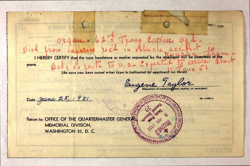 Killed in a vehicle accident May 26, 1951, at the Ashika Air Base, Japan.