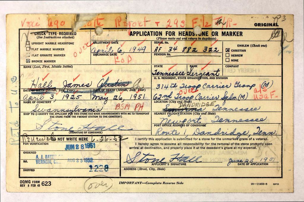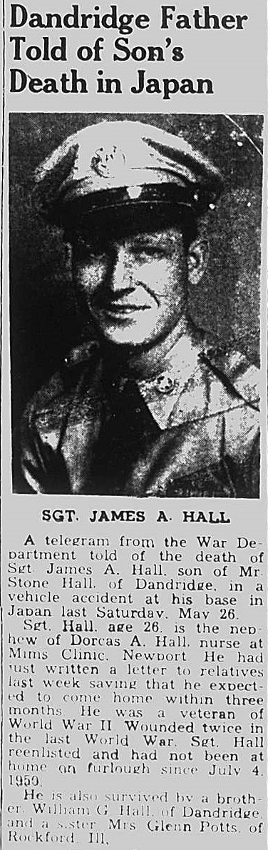 A telegram from the War Department told of the death of Sgt. James A. Hall, son of Mr. Stone Hall, of Dandridge in a vehicle accident at his base in Japan last Saturday, May 26.