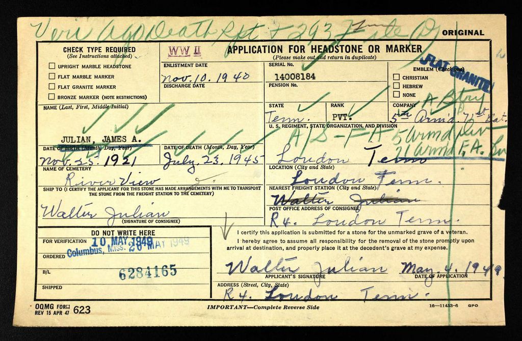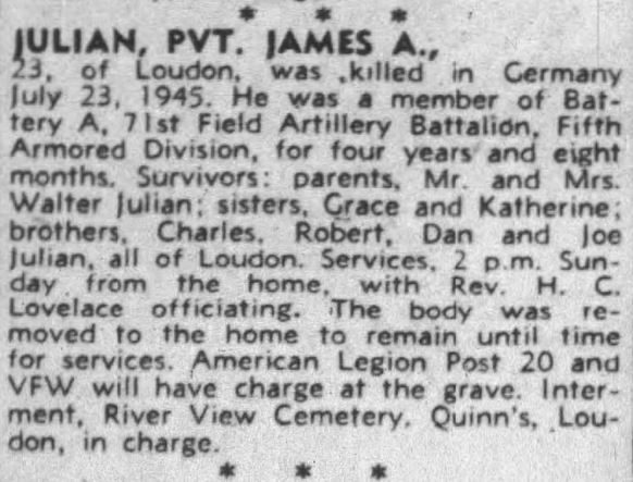 Pvt. James A. Julian, 23, of Loudon, was killed in Germany July 23, 1945. He was a member of Battery A, 71st Field Artillery Battalion, Fifth Armored Division, for four years and eight months. Survivors; parents, Mr. and Mrs. Walter Julian; sisters, Grace and Katherine; brothers, Charles, Robert, Dan and Joe Julian, all of Loudon.