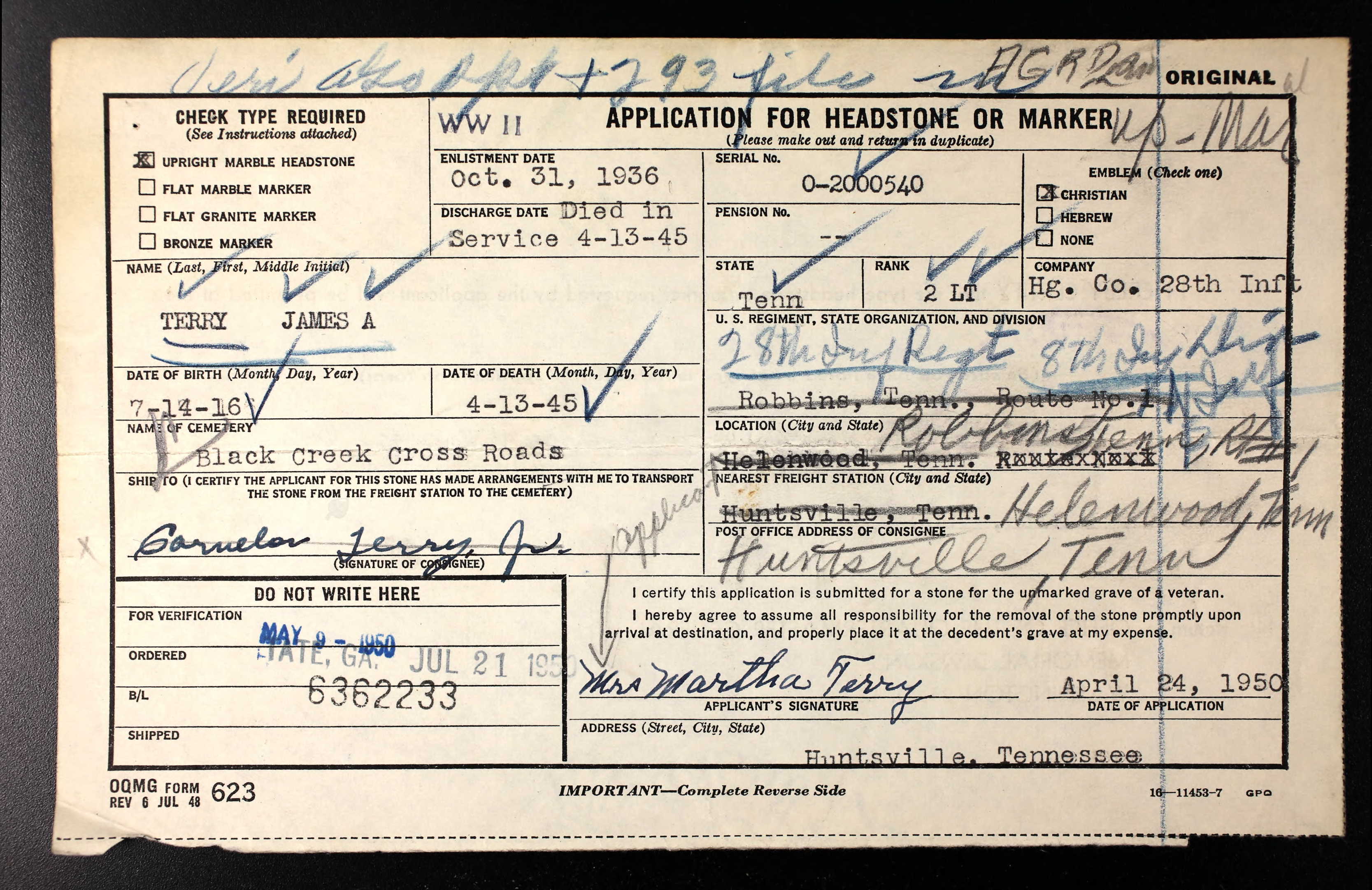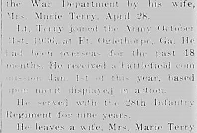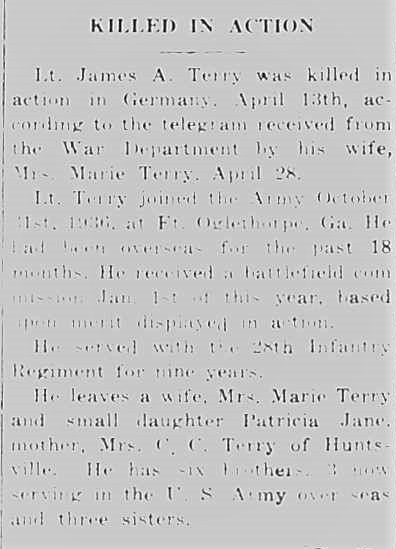 Lt. James A. Terry was killed in action in Germany, April 13th, according to the telegram received from the War Department by his wife, Mrs. Marie Terry, April 28. Lt. Terry joined the Army in October 1936, at Ft. Oglethorpe, Ga. He had been overseas for the past 18 months. He received a battlefield commission January 1st of this year, based upon merit displayed in action. He served with the 28th Infantry Regiment for nine years. He leaves a wife, Mrs. Marie Terry, a small daughter, Patricia Jane, mother Mrs. C.C. Terry of Huntsville. He has six brothers, 3 now serving in the U.S. Army overseas and three sisters.