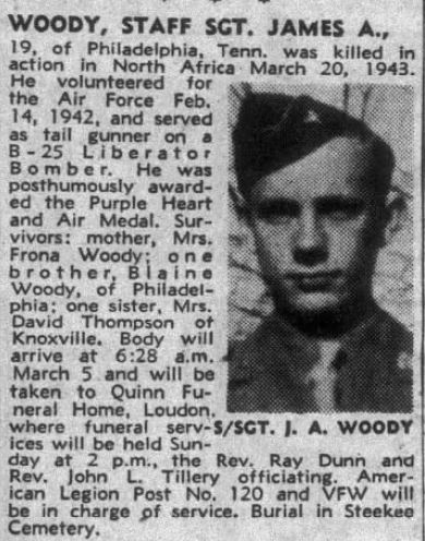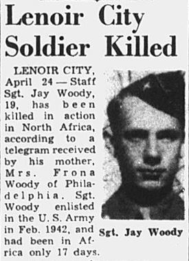 Staff Sgt. Jay Woody, 19, has been killed in action in North Africa, according to a telegram received by his mother, Mrs. Frona Woody of Philadelphia. Sgt. Woody enlisted in the U.S. Army in Feb. 1942, and had been in Africa only 17 days.