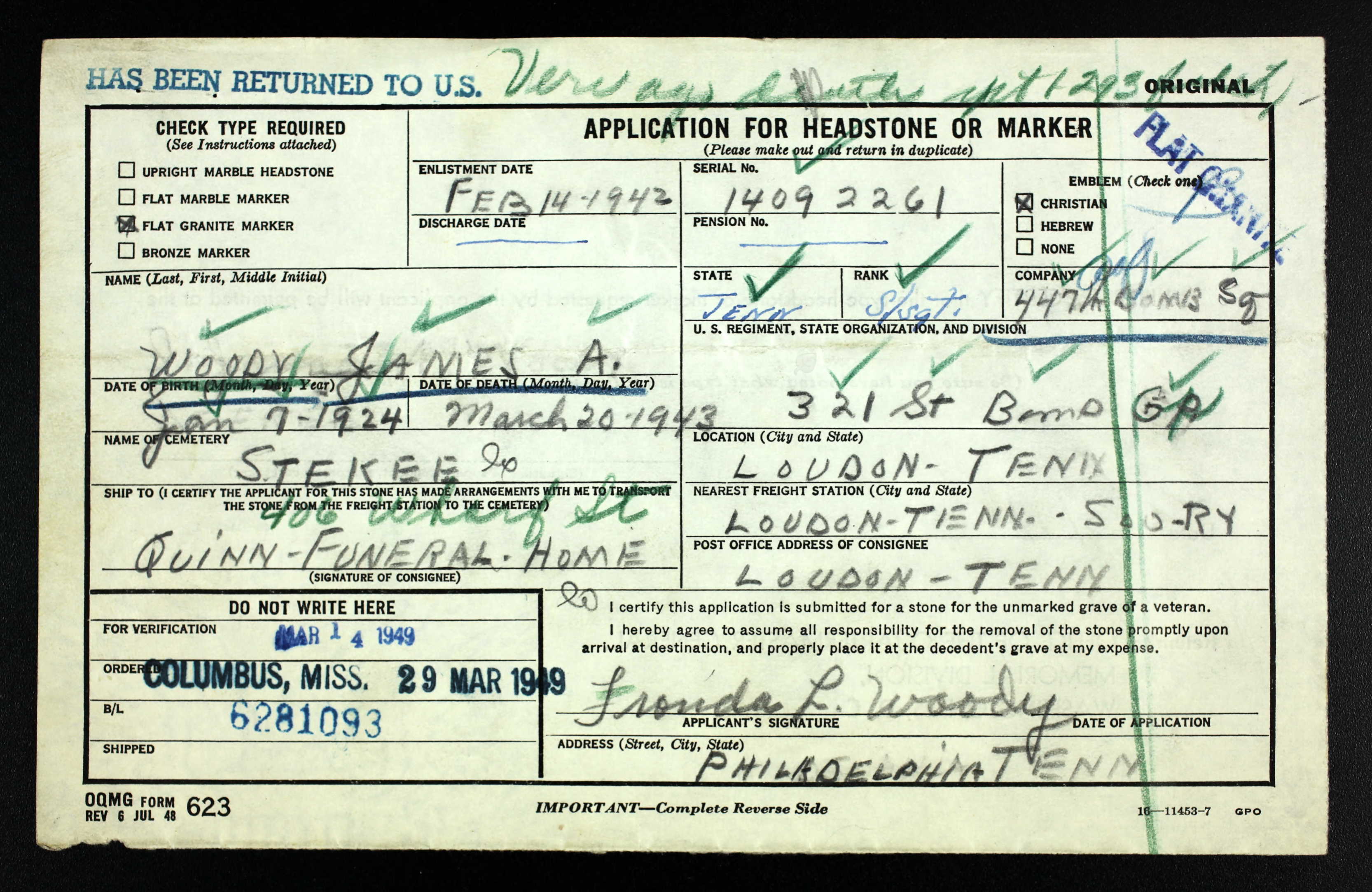 He served with the 447th Bomber Squadron, 321st Bomber Group and was killed in action 20 March 1943 in North Africa.
