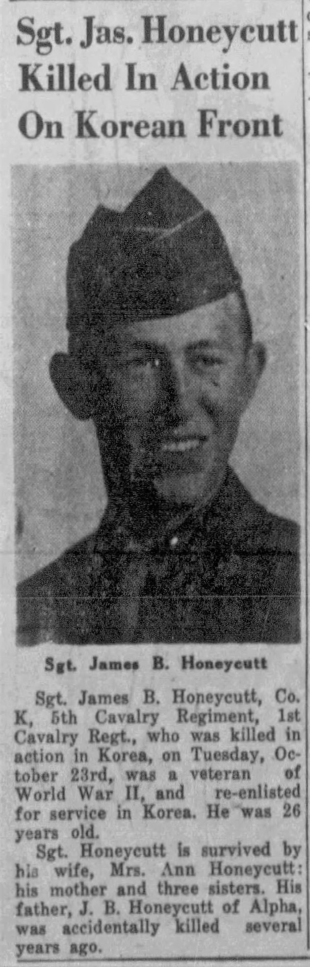 James Honeycutt was a veteran of World War II having entered the Army March 18, 1944, at Camp Shelby, Mississippi. He reentered the Army in January 1951 and left for foreign service on March 18, 1951.