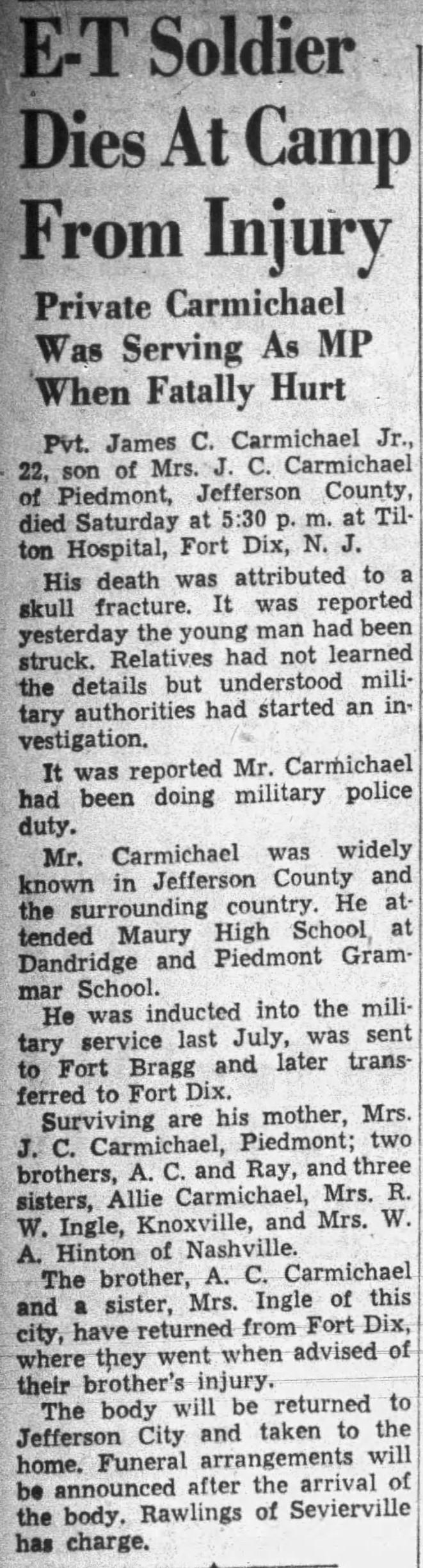 Pvt. James C. Carmichael Jr., 22, son of Mrs. J.C. Carmichael of Piedmont, Jefferson County, died Saturday at 5:30 p.m. at Tilton Hospital, Fort Dix, N.J. His death was attributed to a skull fracture. It was reported yesterday the young man had been struck. Relatives had not learned the details but understood military authorities had started an investigation. It was reported Mc. Carmichael had been doint military police duty. Mr. Carmichael was widely known in Jefferson County and the surrounding country. He attended Maury High School at Dandridge and Pietmont Grammar School. He was inducted into the military service last July, was sent to Fort Bragg and later transferred to Fort Dix. Surviving are his mother, Mrs. J.C. Carmichael, Piedmont’two brothers, A.C. and Ray, and three sisters Allie Carmichael, Mrs. R.W. Ingle, Knoxville and Mrs. W.A. Hinton of Nashville. The brother, A.C. Carmichael and a sister, Mrs. Ingle of this city, have returned from Fort Dix, where they went when advised of their brother’s injury. The body will be returned to Jefferson City and taken to the home.