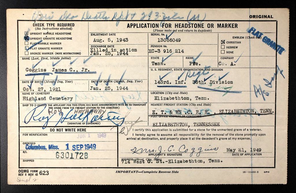PFC Coggins served with the 36th ‘Texas’ Infantry Division, 143rd Infantry Regiment. He was wounded in action on January 25, 1944 and killed in action on January 26, 1944 at the Rapido River Battle in Italy.