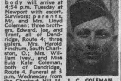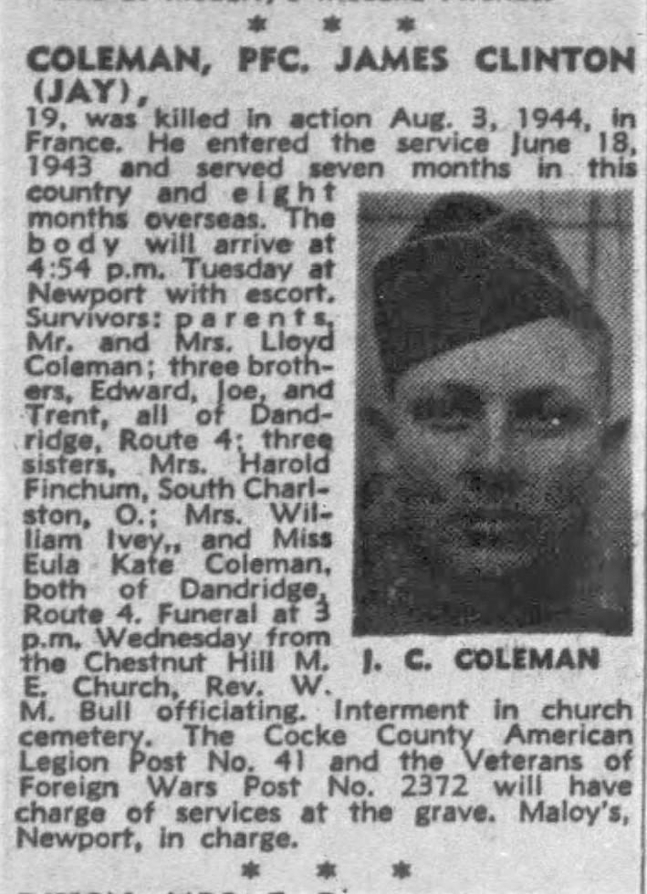 PFC Coleman was killed in action in France. He served with the 44th Armored Infantry Battalion, Company B