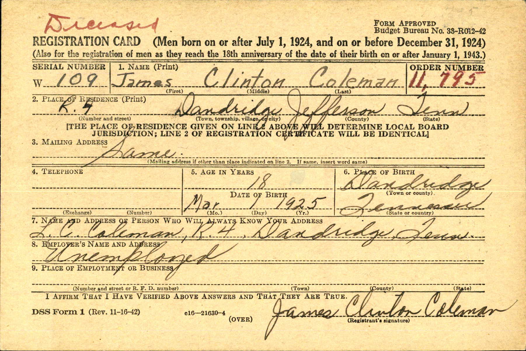 James Clinton Coleman was born at Dandridge, Tennessee, the son of James Loyd Coleman and Lettie M. Thornton.