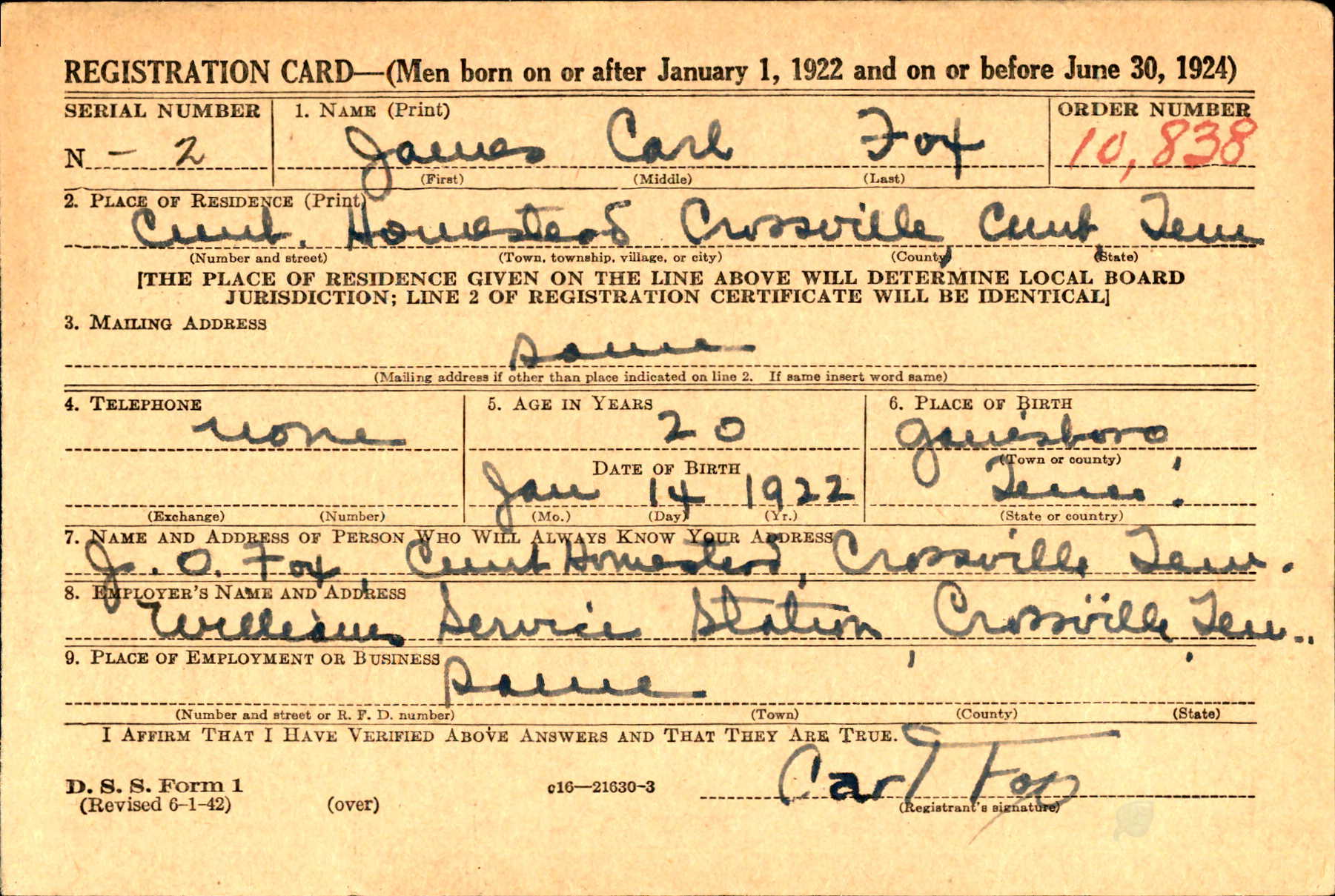 James Carl Fox was born 14 January 1922, the son of James Ottis Fox and Hallie Mae Burton. Husband of Mary Elma Loshbough.