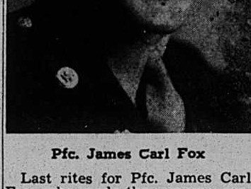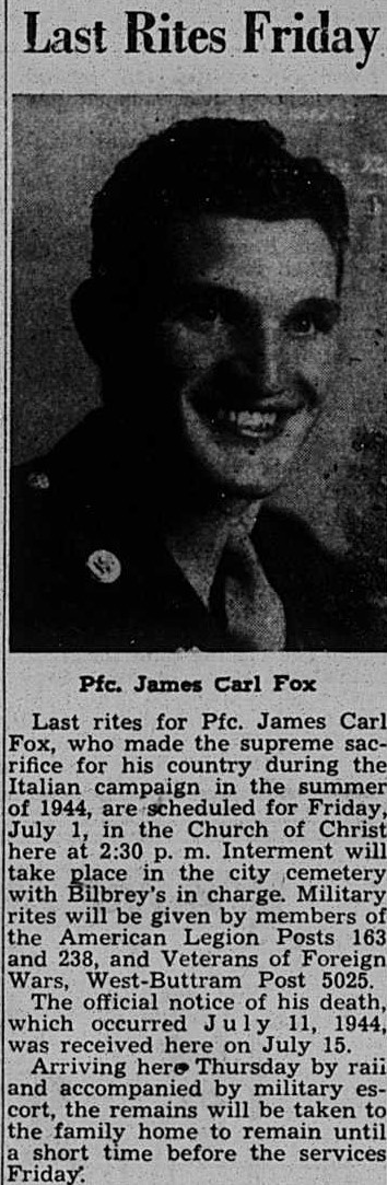 Last rites for Pfc. James Carl Fox, who made the supreme sacrifice for his country during teh Italian campaign in the summer of 1944, are schedulred for July 1, in the Church of Christ. Interment will take place in the city cemetery with Billbrey’s in charge. Military rites will be given by members of the American Legion Post 1963 and 238, and Veterans of Foreign Wars, West-Buttram Post 5025.