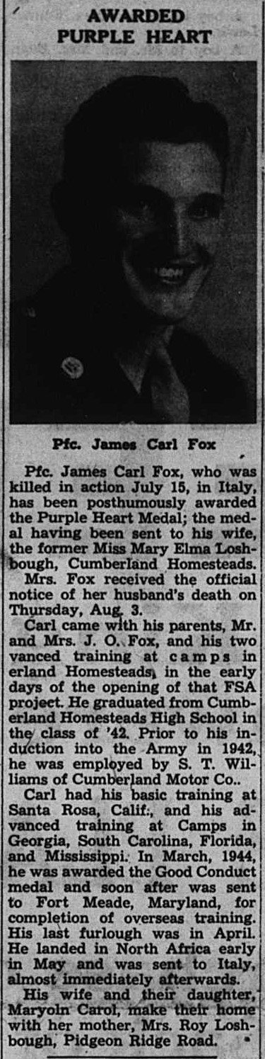 Pfc. James Carl Fox, who was kiled in action July 15, in Italy, has been posthumously awarded the Purple Heart Medal; the medal having been sent to his wife, the former Miss Mary Elma Loshbough, Cumberland Homesteads. Mrs. Fox received teh official notice of her husband’s death on Thursday, Aug. 3. Carl graduated from Cumberland Homesteads High School in the class of ’42. Prior to his induction into the Army in 1942, he was employed by S.T. Williams of Cumberland Motor Co.