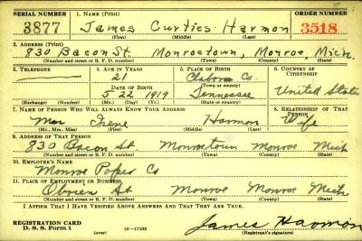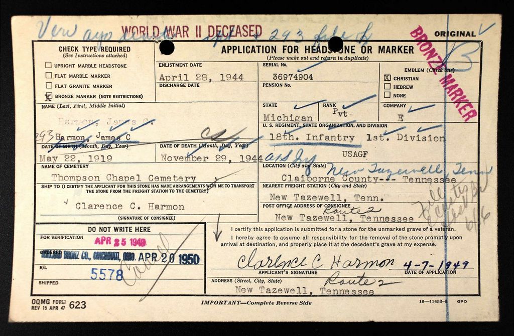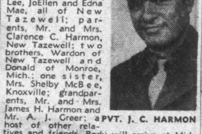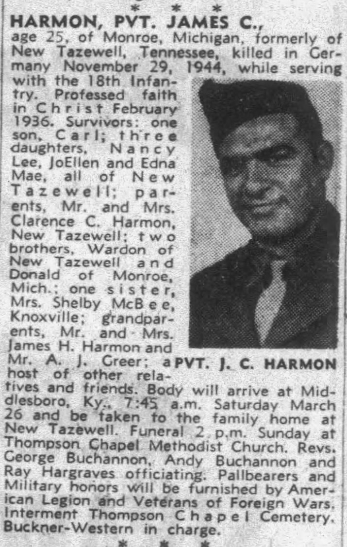 Pvt. James C. Harmon, age 25, of Monroe, Michigan, formerly of New Tazewell, Tennessee, was killed in Germany November 29, 1944, while serving with the 18th Infantry. Professed Faith in Christ February 1936. Survivors: one son, Carl; three daughters, Nancy Lee, JoEllen and Edna Mae, all of New Tazewell; parents, Mr. and Mrs. Clarence C. Harmon, New Tazewell; two brothers, Wardon of New Tazewell and Donald of Monroe, Mich.; one sister, Mrs. Shelby McBee, Knoxville; grandparents, Mr. and Mrs. James H. Harmon and Mr. A.J. Greet, a host of other relatives and friends.