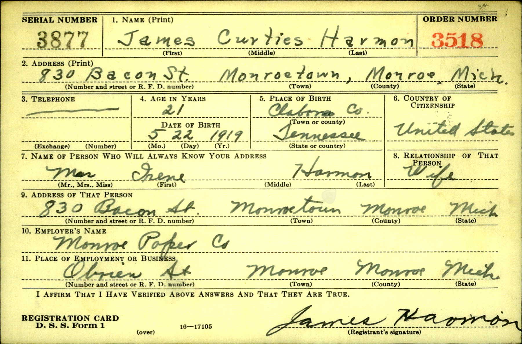 James Curties Harmon was born on 22 May 1919 at New Tazewell, Claiborne County, Tennessee, the son of Clarence Curtis Harmon and Maude M. Greer. He was the husband of Irene Ellison and father of Car Floyd Harmon, Jo Ellen Harmon and Edna Mae Harmon and Nancy Lee Harmon.He died 29 November 1944 in Germany