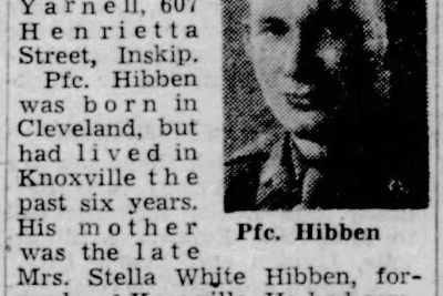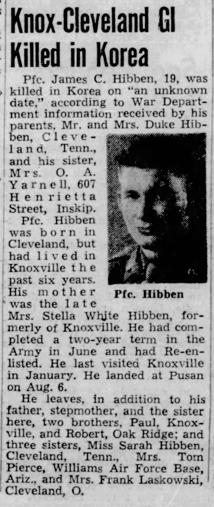 Pfc. James C. Hibben, 19, was killed in Korea on “an unknown date,” according to War Department information received by his parents, Mr. and Mrs. Duke Hibben, Cleveland, Tenn., and his sister, Mrs. O.A. Yarnell, 607 Henrietta Street, Inskip. Pfc. Hibben was born in Cleveland, but had lived in Knoxville the past six years. His mother was the late Mrs. Stella White Hibben, formerly of Knoxville, He had completed a two-year term in the Army in June and had Reee-enlisted. He last visited Knoxville in January. He landed at Pusan on Aug. 6.