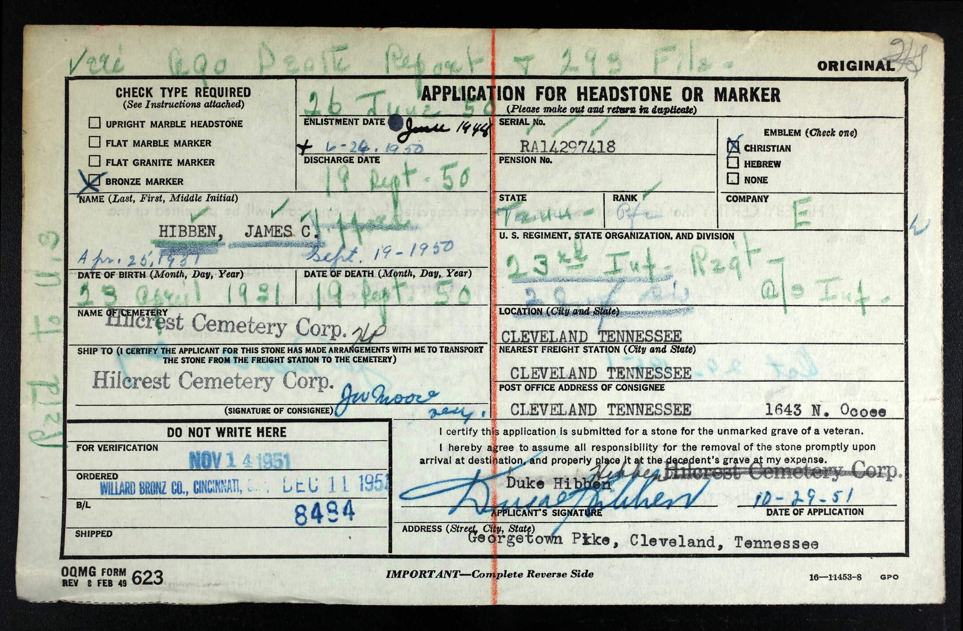 Funeral services for Private First Class James Clifford “Jimmie” Hibben, 19, former student at Park Junior High School, Knoxville, who was killed in action in Korea, will be held at 2 pm tomorrow in Cleveland, TN. The youth was the son of Duke Hibben of Cleveland, TN. He enlisted in the infantry in 1948 and was sent to Korea in 1950. He was killed September 19, 1950. He is survived by brothers, Paul of Knoxville and Robert of Oak Ridge, four sisters, Mrs. O.A. Yarnell, Jr., Inskip, Miss Sarah Hibben, Cleveland, TN, Mrs. Thomas Pierce, Chandler, AZ, and Mrs. Frank Laskowski, Cleveland, TN. Private First Class Hibben was a member of the 23rd Infantry Regiment, 2nd Infantry Division. He was killed in action while fighting the enemy in South Korea.
