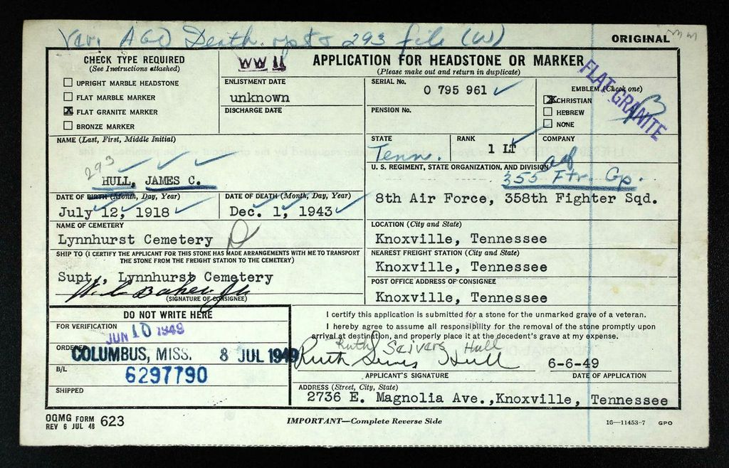First Lt. James C. Hull, pilot of a P-47, was killed in action over Belgium, Dec. 1, the War Department has reported to his mother, Mrs. Ruth S. Hull. The family was advised Lieutenant Hull was missing, Dec. 8, and word he was killed was received Sunday. The only other survivor is a sister, Mrs. Gordon Brown, also of 2730 Magnolia Avenue. Lieutenant Hull, who was 25, was graduated from Knoxville High School. He enlisted in May, 1941, and received his wings at Marietta, Ga., in January 1943. He had been awarded the Air Medal.