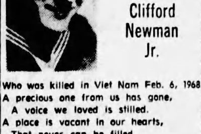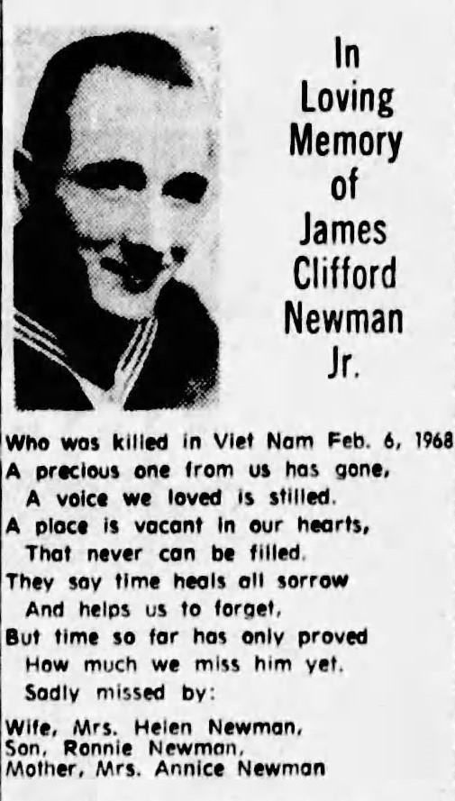 Aviation Machinist’s Mate (Reciprocating), First Class Newman was livign in Knoxville, TN when he entered the service and was a member of Patrol Squadron 26, at U Tapao Airbase, Thailand.