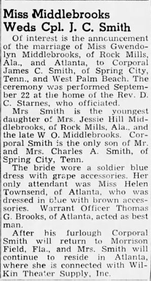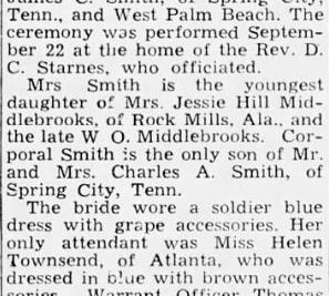 James Conly Smith, born on 5 March 1923 in Rhea County, son of Charles A. Smith of Spring City. He was married to Gwendolyn Middlebrooks in 1943 while he was stationed at Morrison Field in Florida.