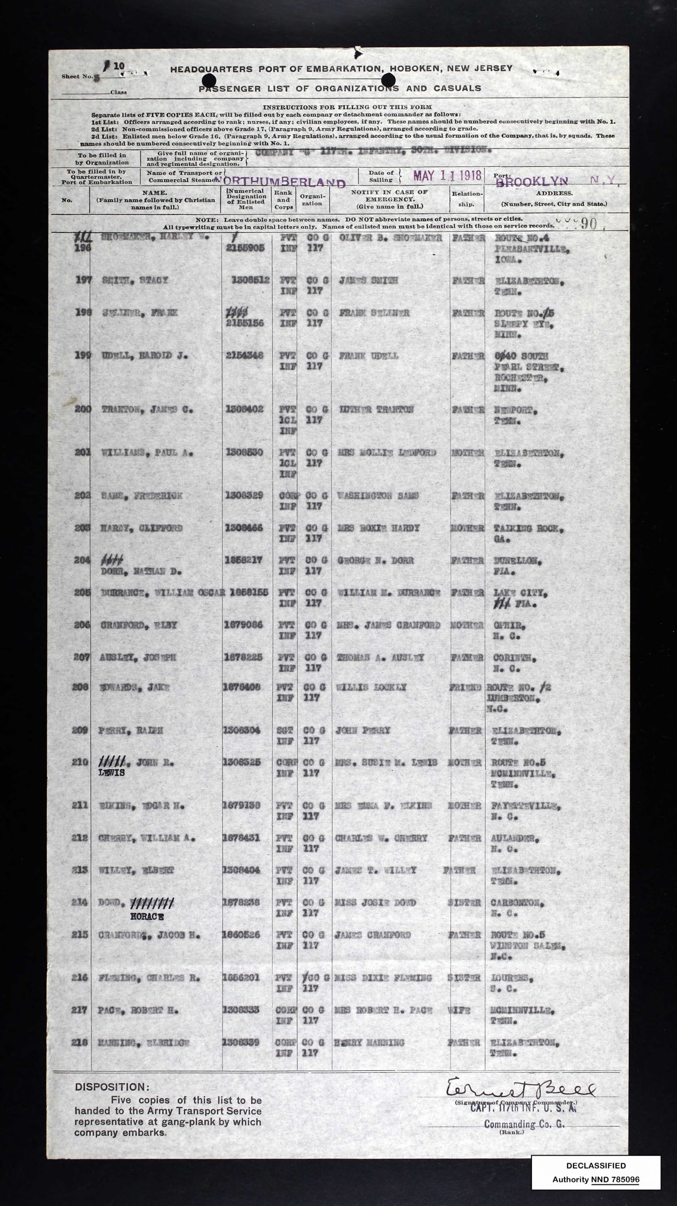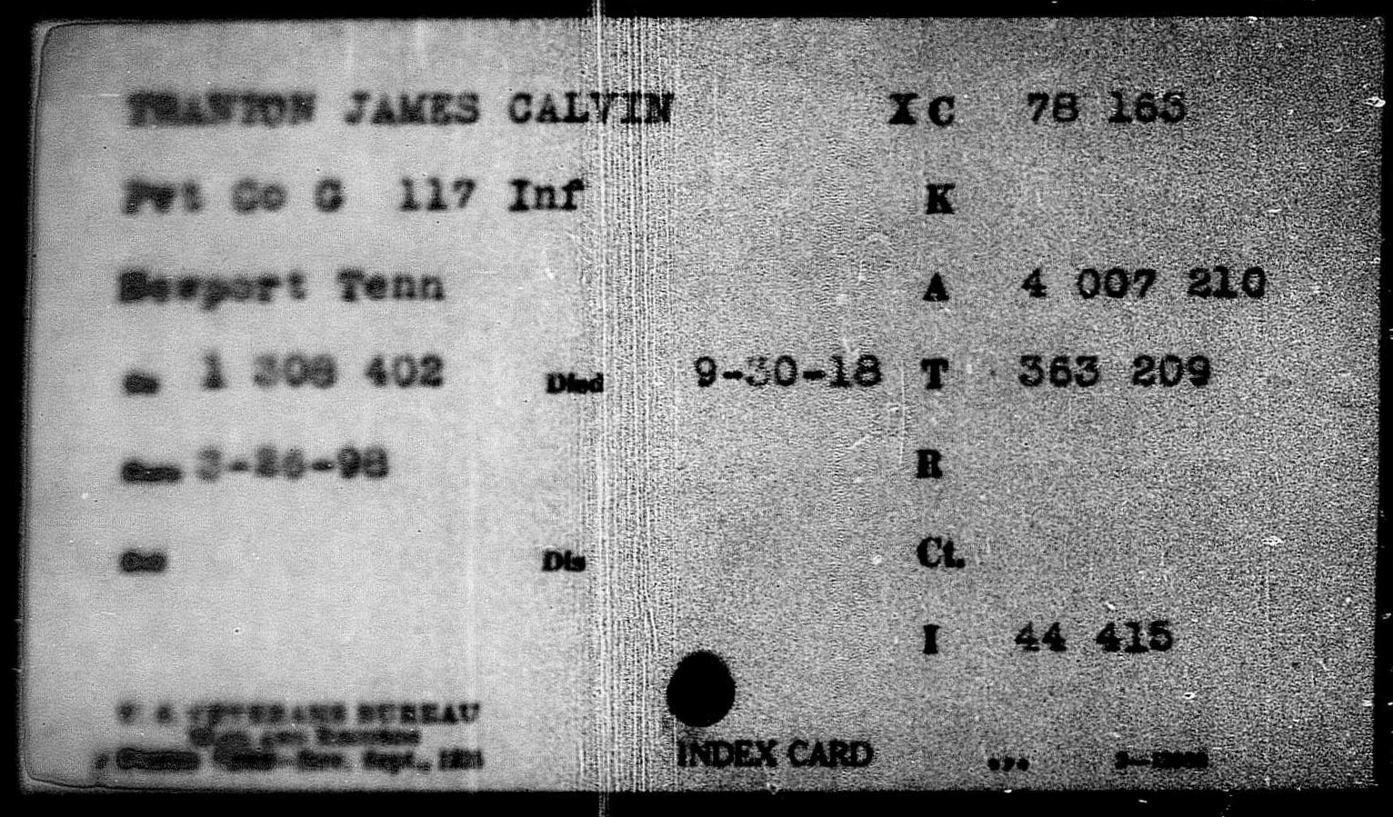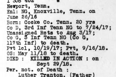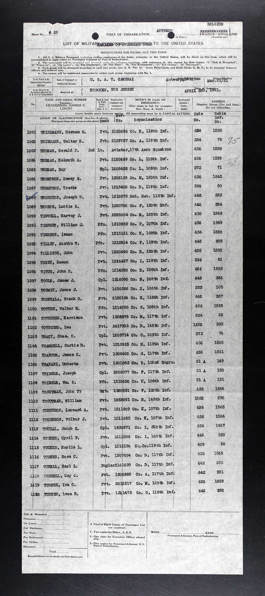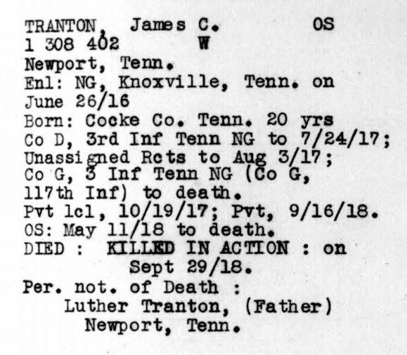 He departed on 11 May 1918 from Brooklyn, N.Y. and served with Company G, 117th Infantry, 30th Division. He was killed in action on 30 September 1918 in France and was shipped back to the U.S. with the U.S.A.T. Cambrai, Leaving Antwerp in Belgium on 21 March 1921 and arriving in Hoboken, New Jersey on April 3rd, 1921.