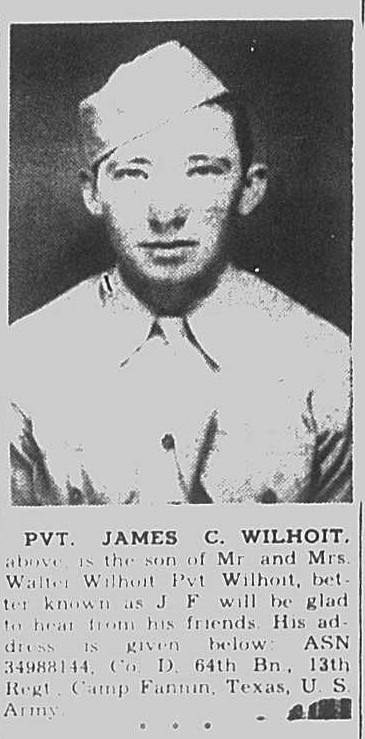 Pvt. James C. Wilhoit is the son of Mr. and Mrs. Walter Wilhoit. Pvt Wilhoit better known as J F will be glad to hear from his friends. His address is given as, ASN 34988144, Co. D, 64th Bn, 13th Regt. Camp Fannin, Texas, U.S. Army.