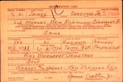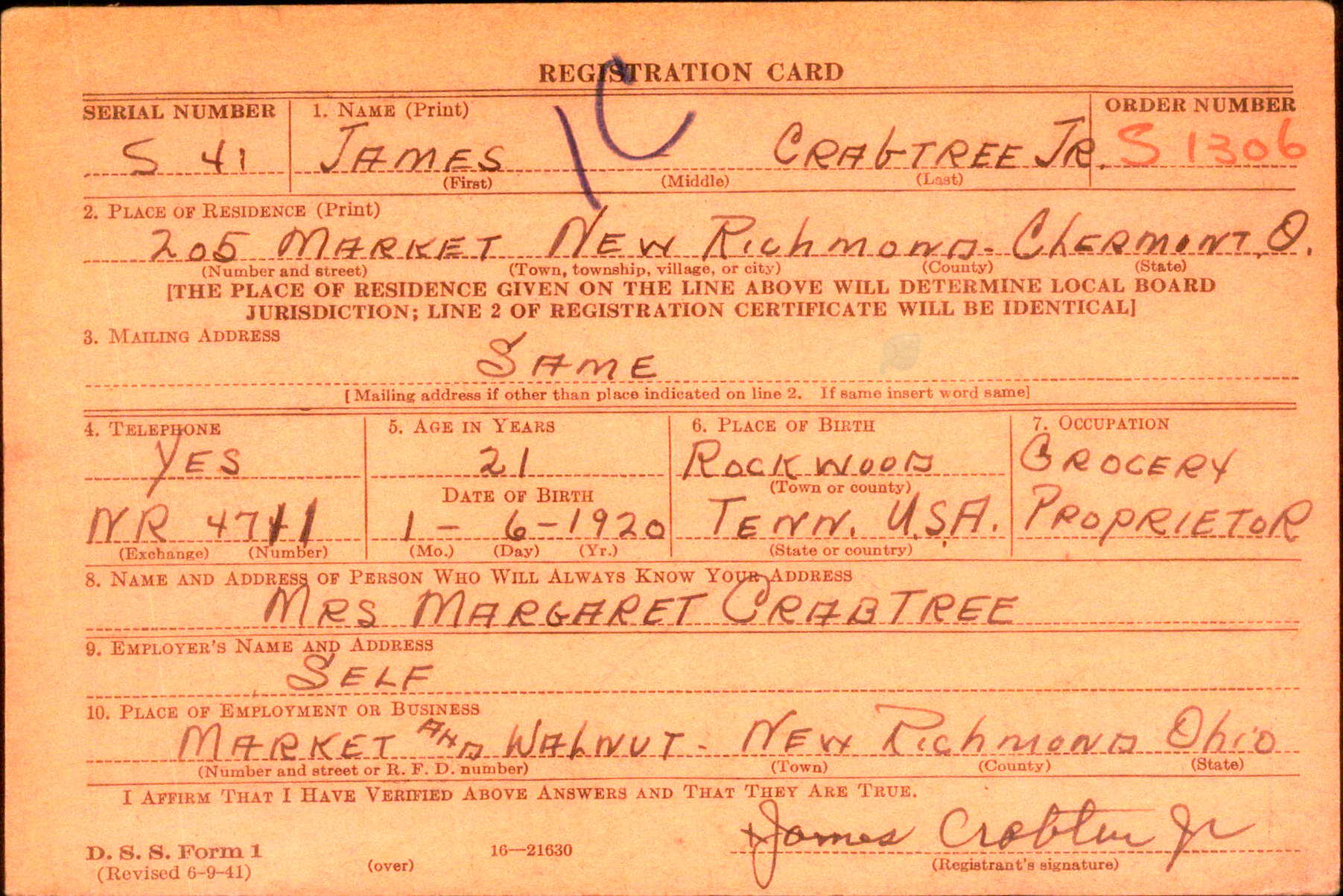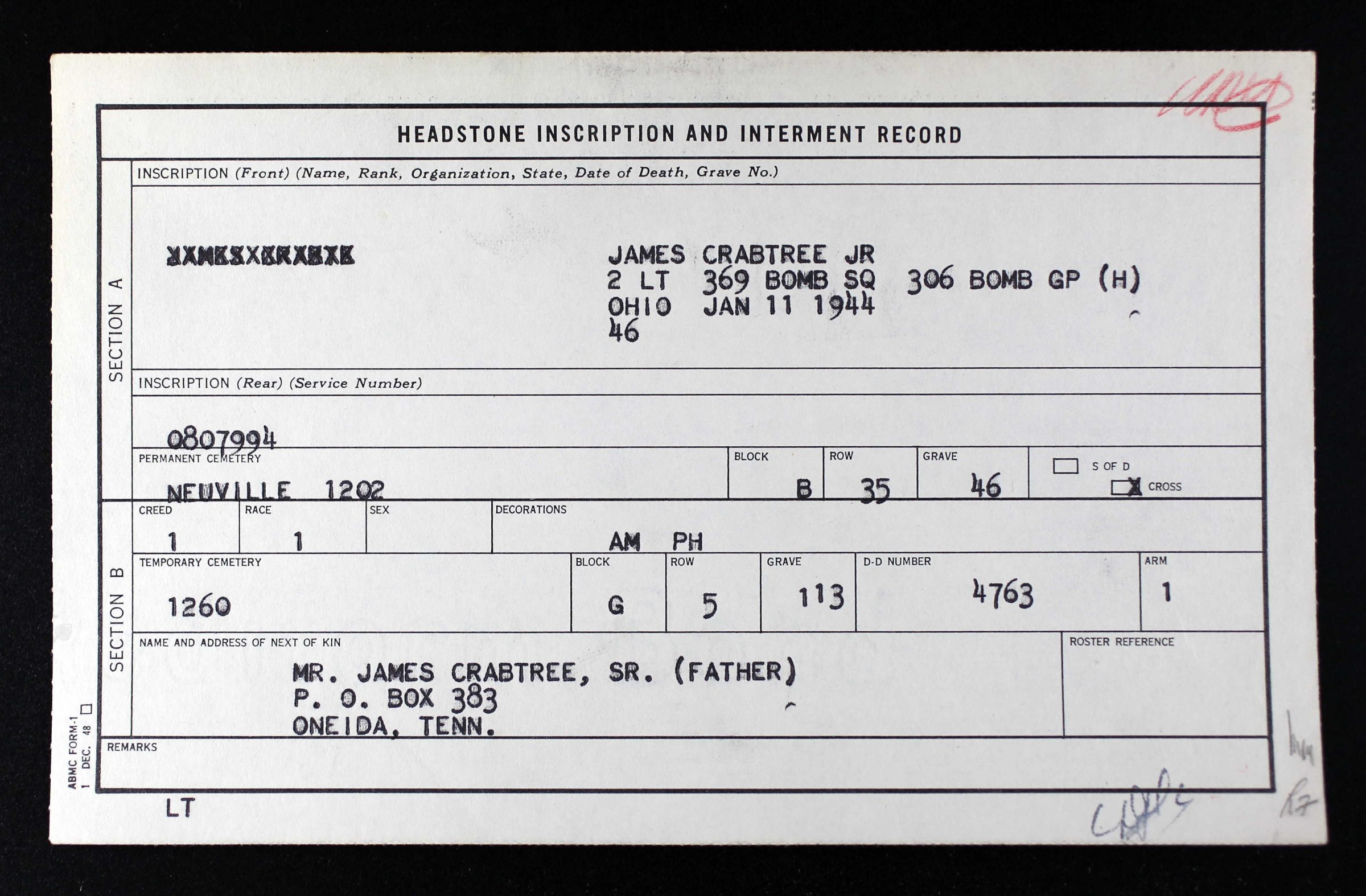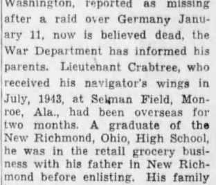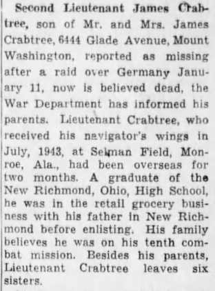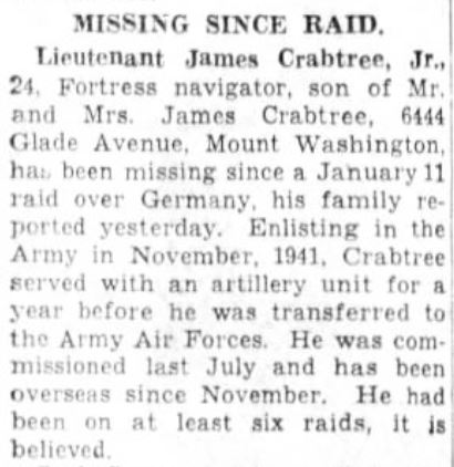 Lieutenant James Crabtree Jr., 24, Fortress navigator, son of Mr. and Mrs. James Crabtree, 6444 Glade Avenue, Mount Washington, has been missing since a January 11 raid over Germany, his family reported yesterday. Enlisting in the Army in November, 1941, Crabtree served with an artillery unit for a year before he was transferred to the Army Air Forces. He was commissioned last July and has been overseas since November. He had been on at least six raids, it is believed.