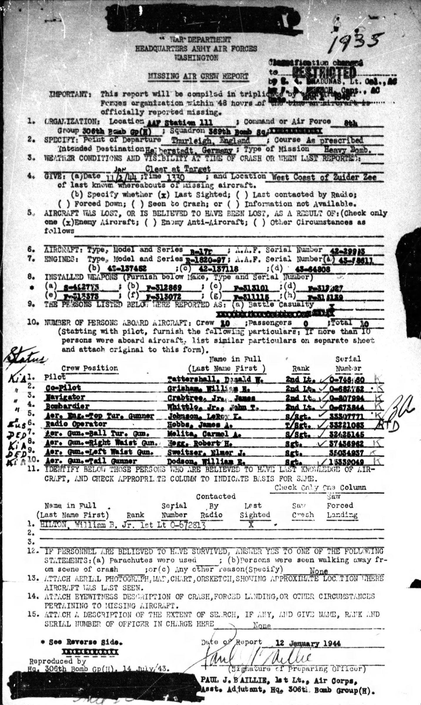 - Division/Assignment: 369th Bomber Squadron, 306th Bomber Group, Heavy