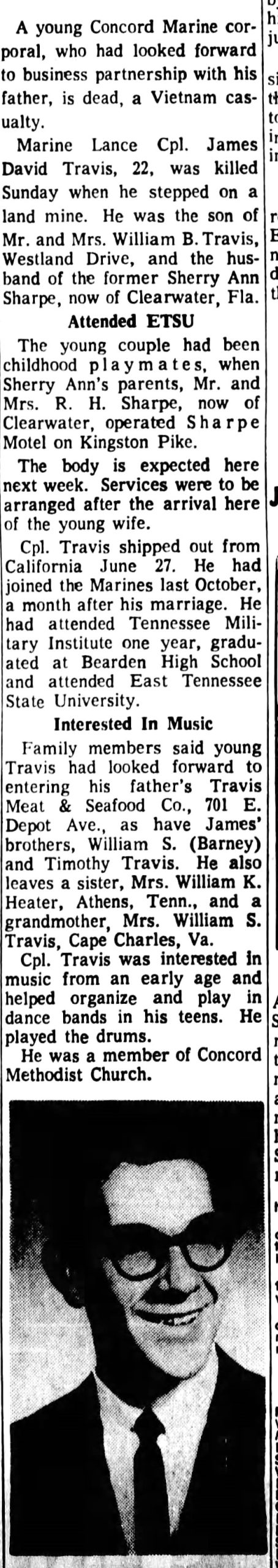 “Damn you! You never did teach me to drive a bulldozer. Travis was my Friend since Parris Island in 66. We came all the way from bootcamp to Tank school to RVN together. All the way to one of the worst nights of my life at ASP#1 where he lost his life in a stupid and tragic way. I’ll never really know what happened that night, even though I was right there. I only hope you’ve been in a better place than that mudhole country that you died in. We had some great times at the Red Cross music room at hill 327 bangin out that Rock & Roll. Hope I was a friend to you, you were to me. Always in my thoughts Semper Fi” -D.C. Fresch, fellow Marine and friend from Parris Island