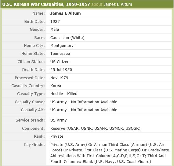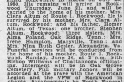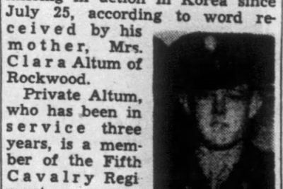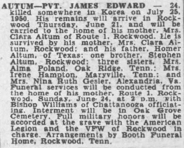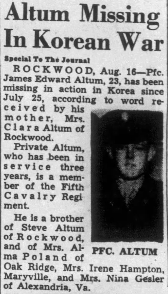 Pfc. James Edward Altum, 23, has been missing in action in Korea since July 25, according to word received by his mother, Mrs. Clara Altum of Rockwood. Private Altum, who has been in service three years, is a member of the Fifth Cavalry Regiment. He is a brother of Steve Altum of Rockwood, and of Mrs. Alma Poland of Oak Ridge, Mrs. Irene Hampton, Maryville and Mrs. Nina Gesler of Alexandria, Va.