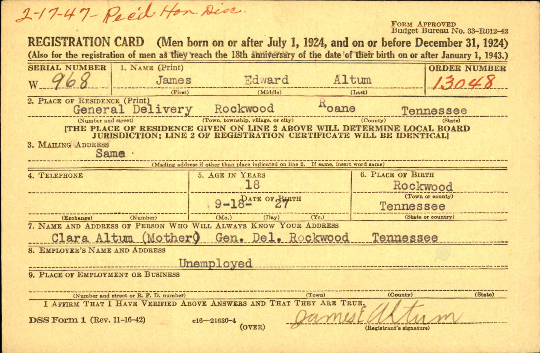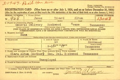James Edward Altum was born in Rockwood, Tennessee, the son of Homer C. Altum and Clara Ann Cline.