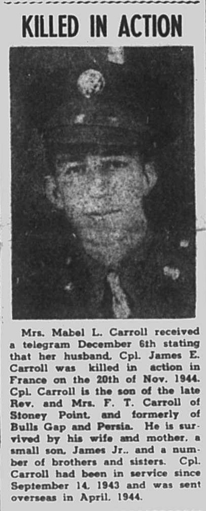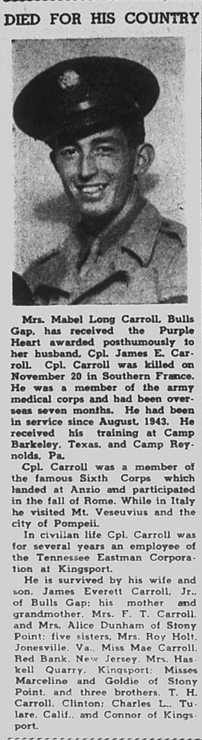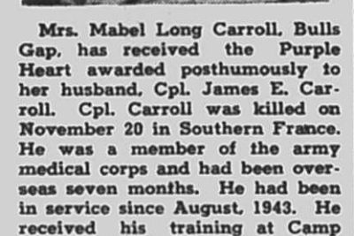 Mrs. Mabel Long Carroll, Bulls Gap, has received the Purple Heart awarded posthumously to her husband, Cpl. James E. Carroll. Cpl. Carroll was killed on November 20 in Southern France. He was a member of the army medical corps and had been overseas seven months. He had been in service since August, 1943. He received his training at Camp Barkeley, texas and Camp Reynolds, Pa.