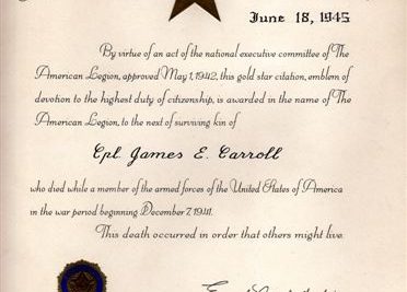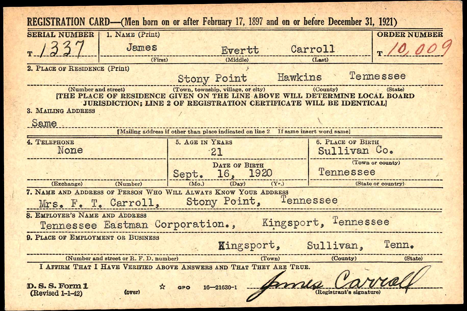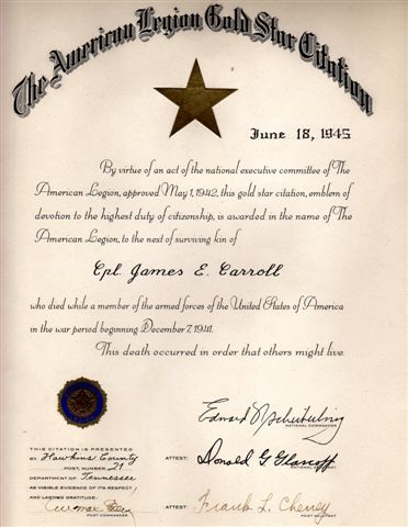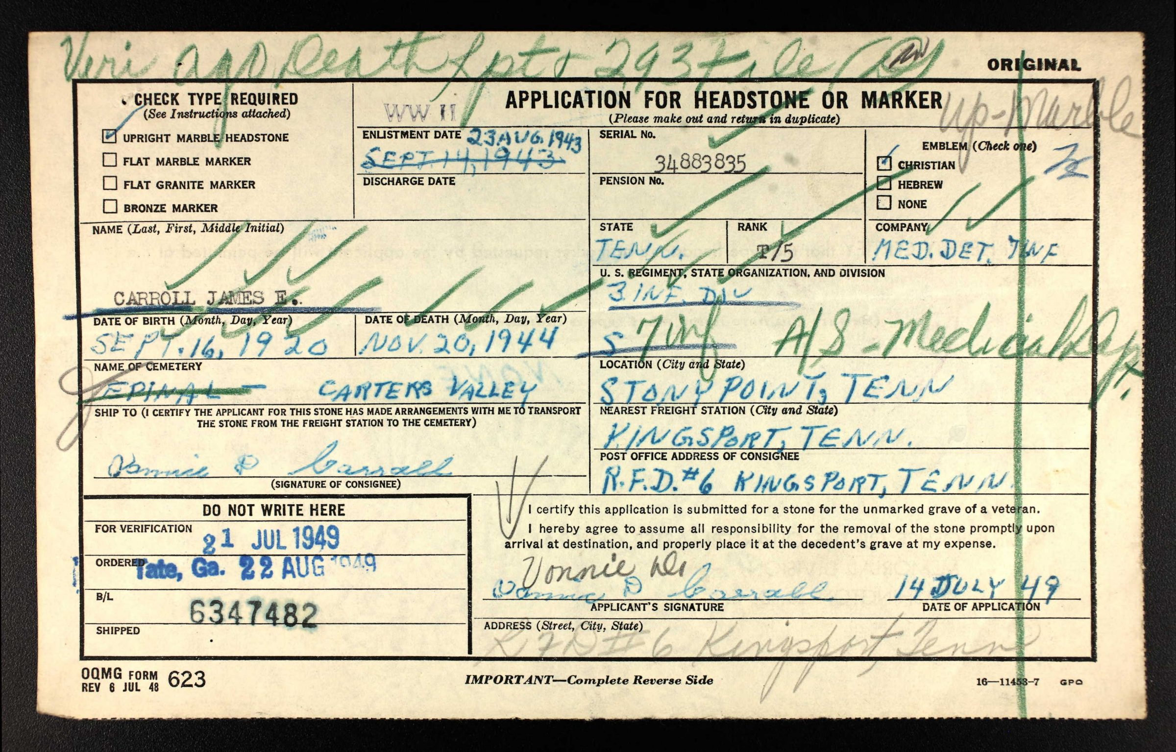 Cpl. James Everett Carroll was the son of Rev. Ferdinand Tilford Carroll and Vonia Lou Dunham. He married Mabel Lorraine Long on 9 March 1940 in Hawkins County, Tennessee.
