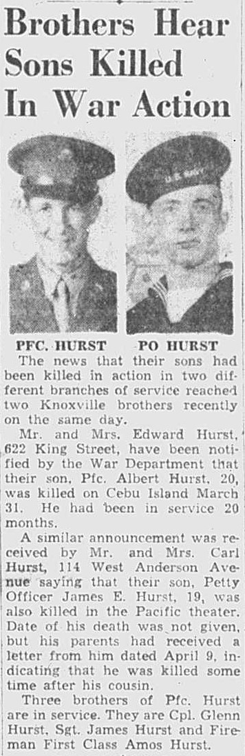 Brothers hear sons killed in War action. The news that their sons had been killed in action in two different branches of service reached two Knoxville brothers recently on the same day. Mr. and Mrs. Edward Hurst, 622 King Street, have been notified by the War Department that their son Pfc. Albert Hurst, 20, was killed on Cebu Island March 31. He had been in service 20 months. A similar announcement was received by Mr. and Mrs. Carl Hurst, 114 West Anderson Avenue saying that their son, Petty Officer James E. Hurst, 19, was also killed in the Pacific theater. Date of his death was not given, but his parents had received a letter from him dated April 9, indicating that he was killed some time after his cousin. Three brothers of Pfc. Hurst are in service. They are Cpl. Glenn Hurst, Sgt James Hurst and Fireman First Class Amos Hurst.