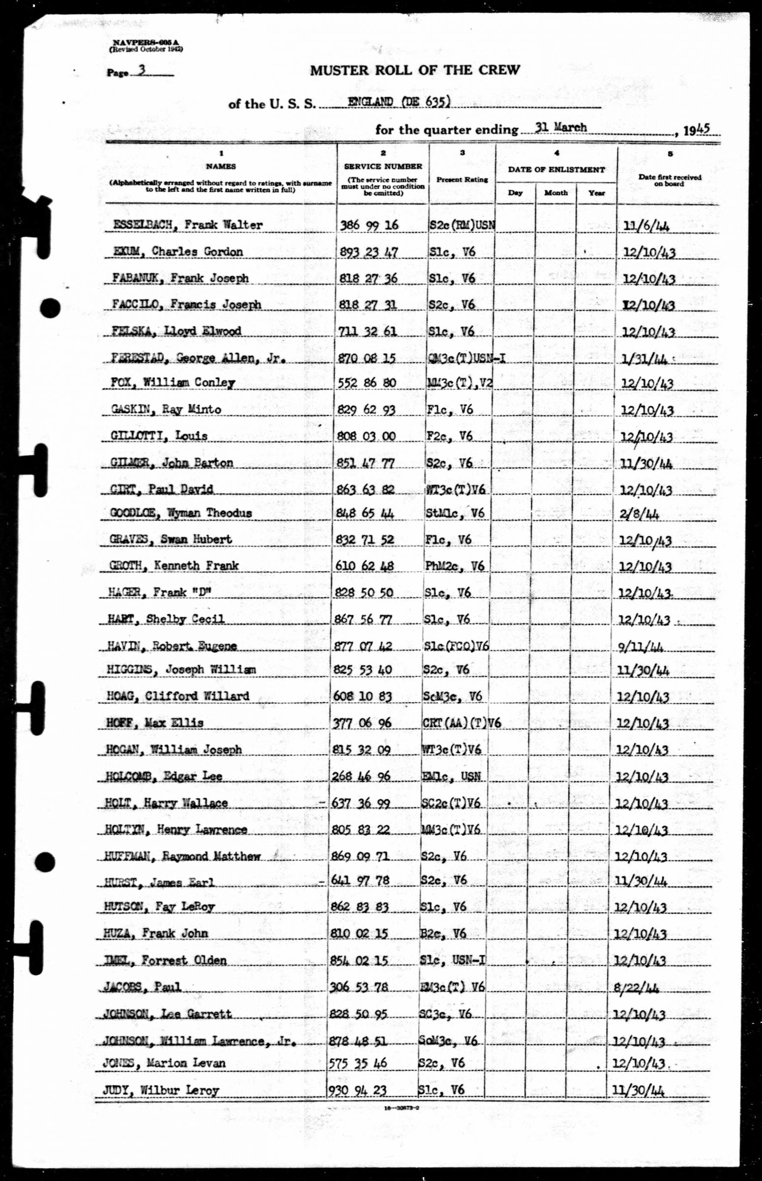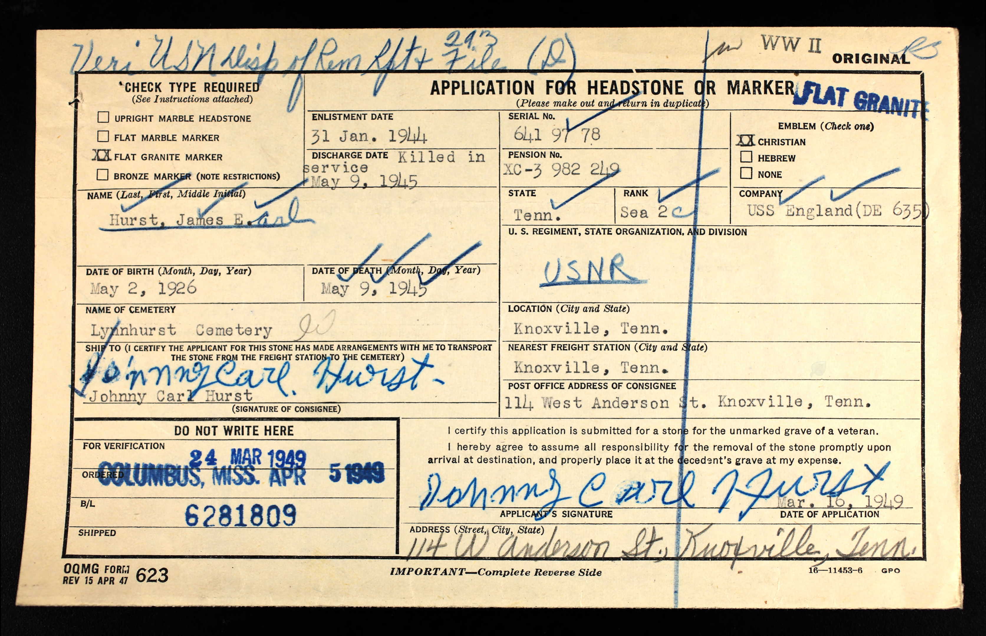James Earl Hurst was born 2 May 1926, the son of John Carl Hurst and Mary Davis. He attended Knoxville High School. Served on the U.S.S. England (DE 635) and killed in action on 9 May 1945 on Okinawa.