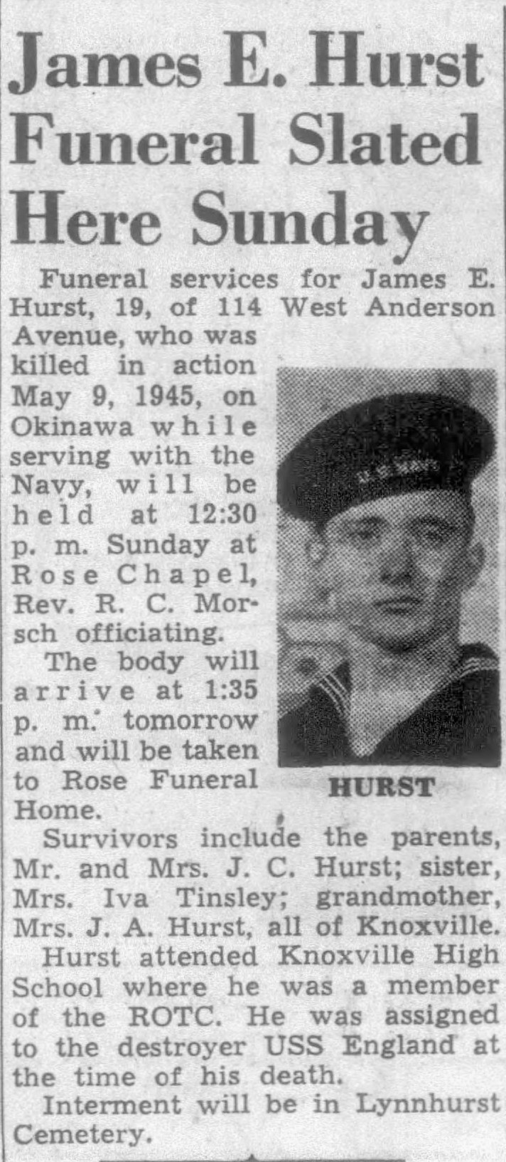 Funeral services for James E. Hurst, 19, of 114 West Anderson Avenue, who was killed in action May 9, 1945, on Okinawa while serving with the Navy, will be held at Rose Chapel. Survivors include the parents, Mr. and Mrs. J.C. Hurst; sister, Mrs. Iva Tinsley; granmother, Mrs. J.A. Hurst, all of Knoxville. Hurst attended Knoxville High School where he was a member of the ROTC. He was assigned to the destroyer USS England at the time of his death. Interment will be in Lynnhurst Cemetery.