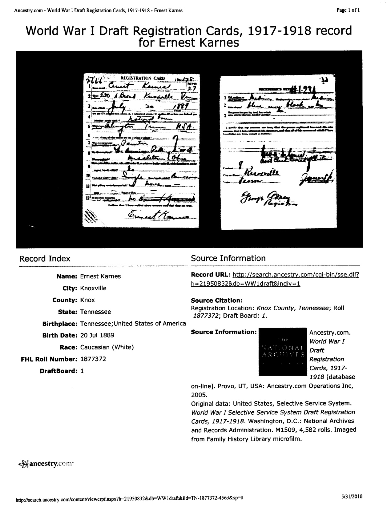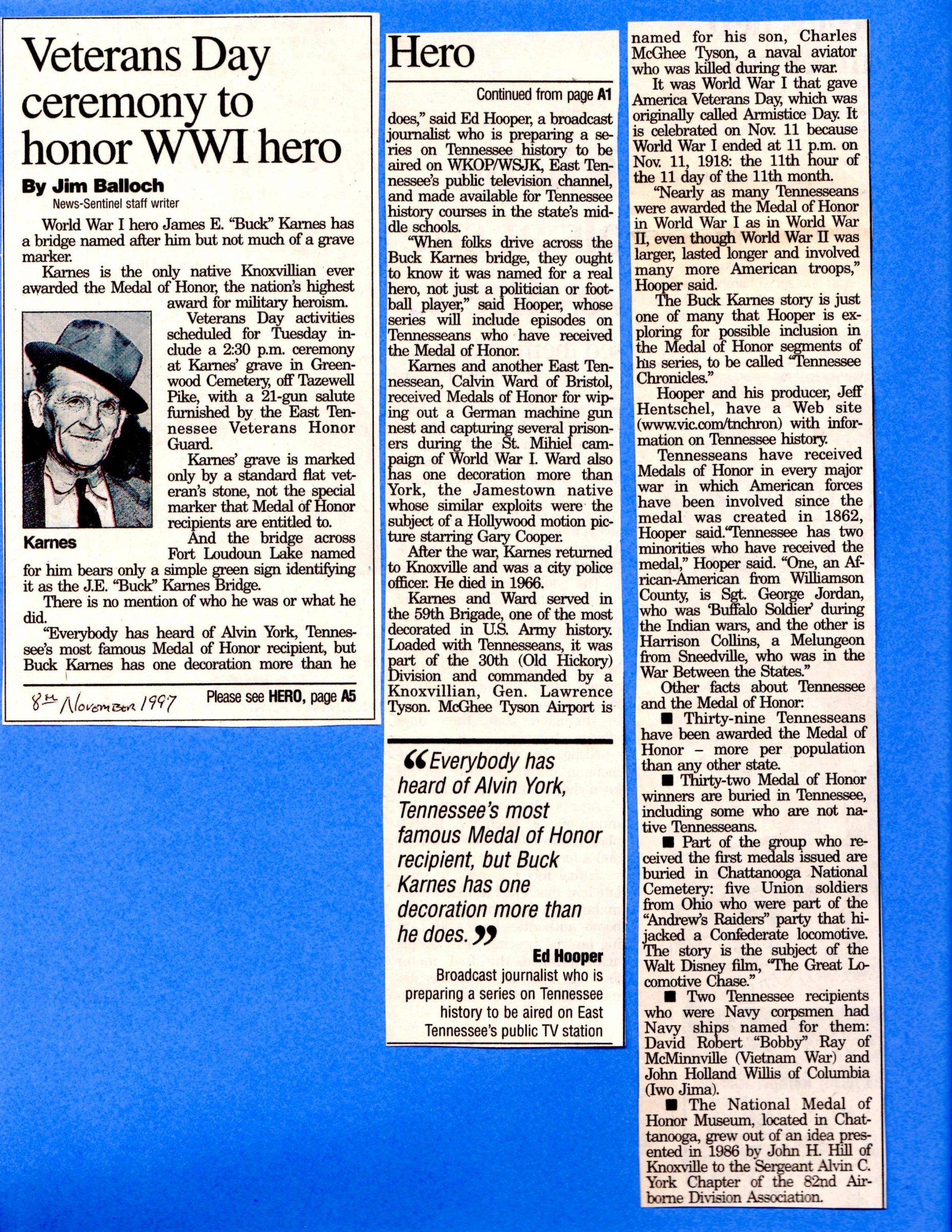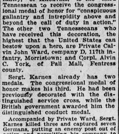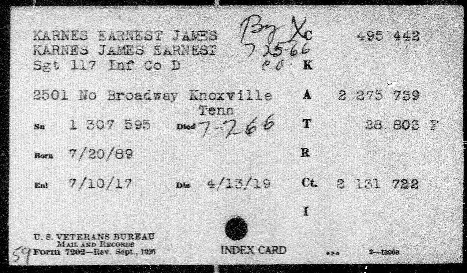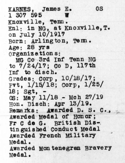 Sergeant James Ernest (Buck) Karnes was born on July 20, 1889 in Arlington, Tennessee and died on July 7, 1966. He was from Knoxville and served with the 117th Infantry, 30th Infantry Division in France. He is buried at Greenwood Cemetery in Knoxville.