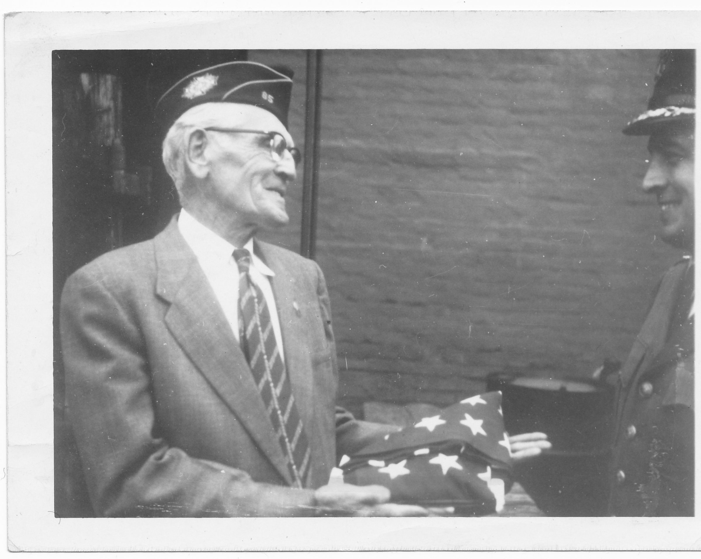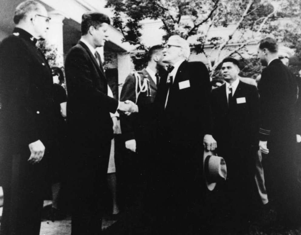Knoxville World War I hero James E. “Buck” Karnes shaking hands with President Kennedy at a reception for Medal of Honor winners at the White House, May 1963. He was accompanied by his eldest daughter, Mae Bess Karnes Carrier.