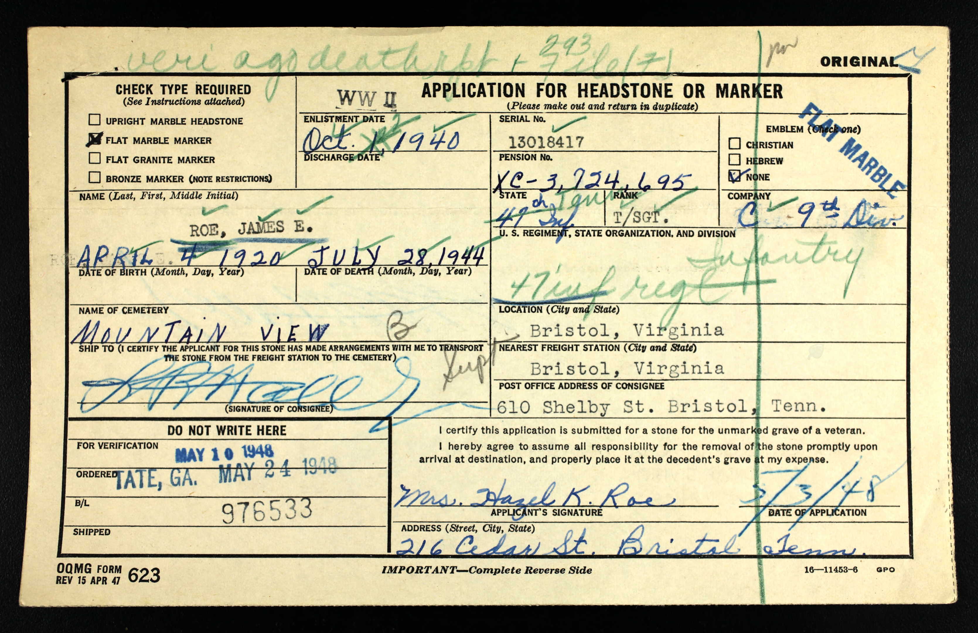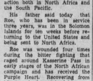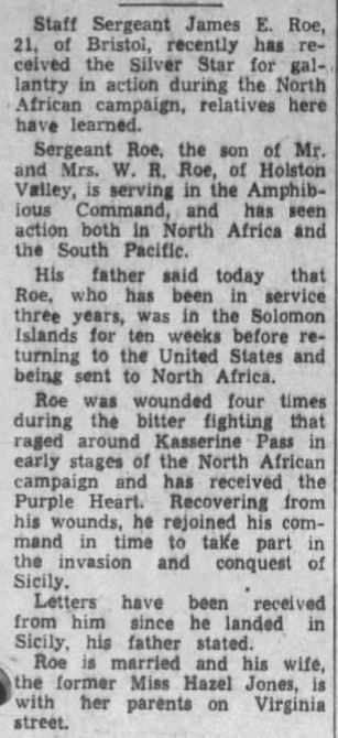 Staff Sergeant James E. Roe, 21, of Bristol, recently has received the Silver Star for gallantry in action during the North African campaign, relatives here have learned. Sergeant Roe, the son of Mr. and Mrs. W.R. Roe, of Holston Valley, is serving in the Amphibious Command, and has seen action both in North Africa and the South Pacific. His father said yesterday that Roe, who has been in service three years, was in the Solomon Islands for ten weeks before returning to the United States and being sent to North Africa. Roe was wounded four times during the bitter fighting that raged around Kasserine Pass in early stages of the North African campaign and has received the Purple Heart. Recovering from his wounds, he rejoined his command in time to take part in the invasion and conquest of Sicily. Letters have been received from him since he landed in Sicily, his father said. Roe is married and his wife, the former Miss Hazel Jones, is with her parents on Virginia street.