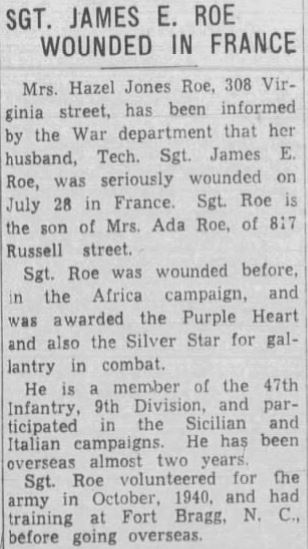 Mrs. Hazel Jones Roe, 308 Virginia Street, has been informed by the War Department that her husband, Tech. Sgt. James E. Roe, was seriously wounded on July 28 in France. Sgt. Roe is the son of Mrs. Ada Roe, of 817 Russell street. Sgt. Roe was wounded before, in the Africa campaign, and was awarded the Purple Heart and also the Silver Star for gallantry in combat. He is a member of the 47th Infantry, 9th Division, and participated in the Sicilian and Italian Campaigns. He has been overseas almost two years. Sgt. Roe volunteered for the army in October, 1940, and had trained at Fort Bragg, N.C., before going overseas.
