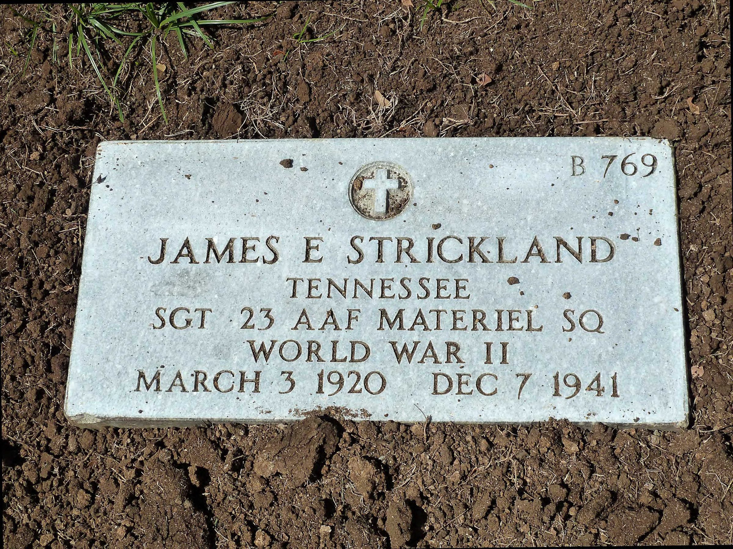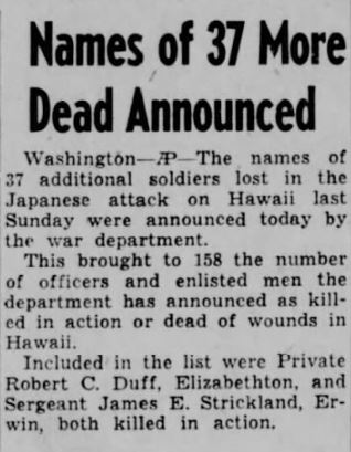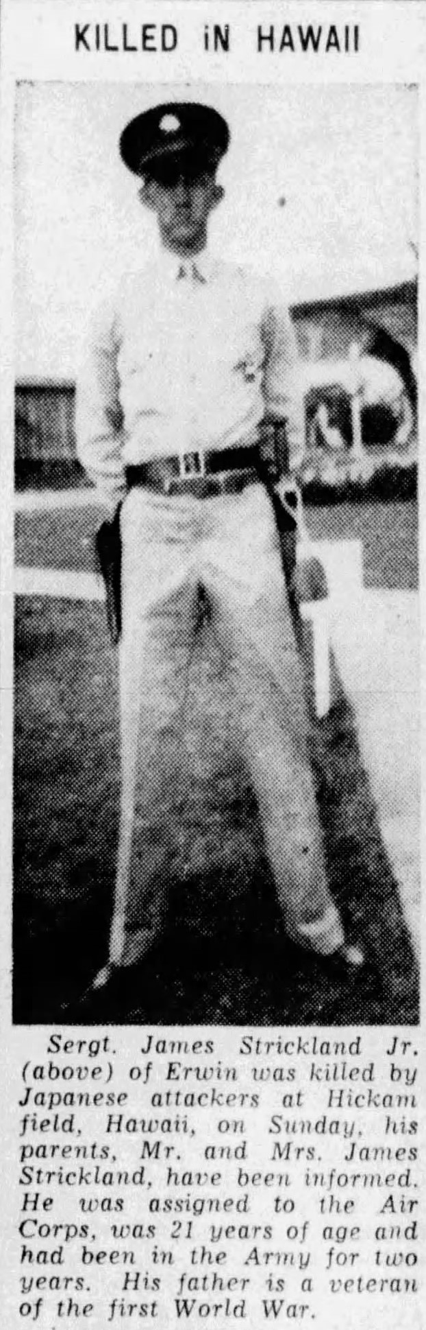 James E. Strickland, 21, a sergeant in the ordnance department of the army air corps, was among the first casualties of the attack on Honolulu, according to official word received here yesterday by his parents, Mr. and Mrs. James E. Strickland, Sr., Erwin, Tenn.