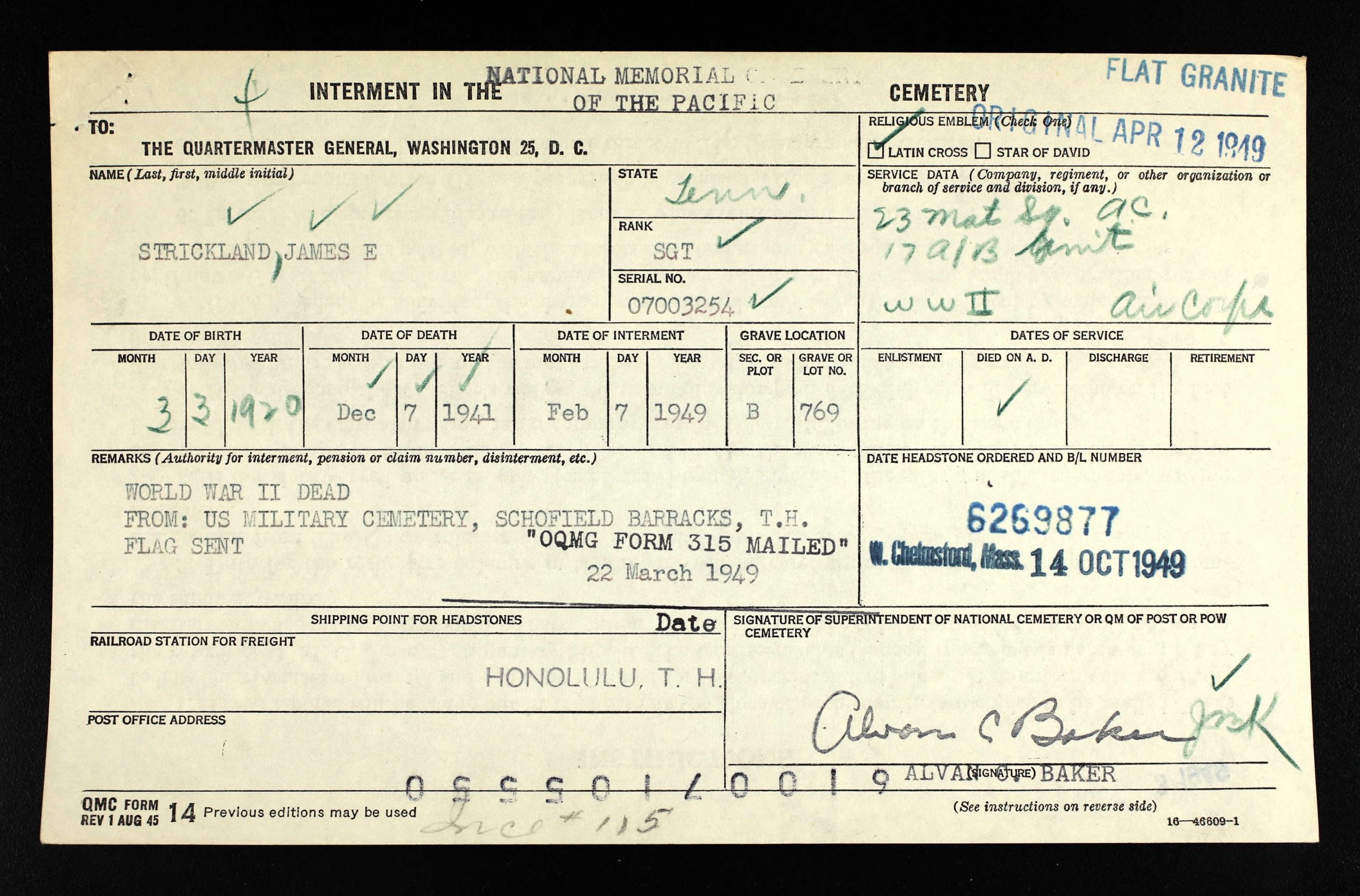 - Burial/Memorial Location: Honolulu Memorial, Honolulu, Hawaii