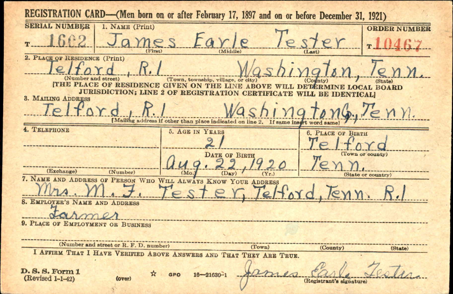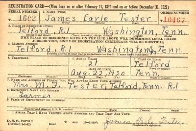 James Earle Tester was born on 26 August 1920 in Telford, Washington County, Tennessee. Son of Millard Franklin Tester and Eliza Catherine Walker. He was killed in action in Germany.
