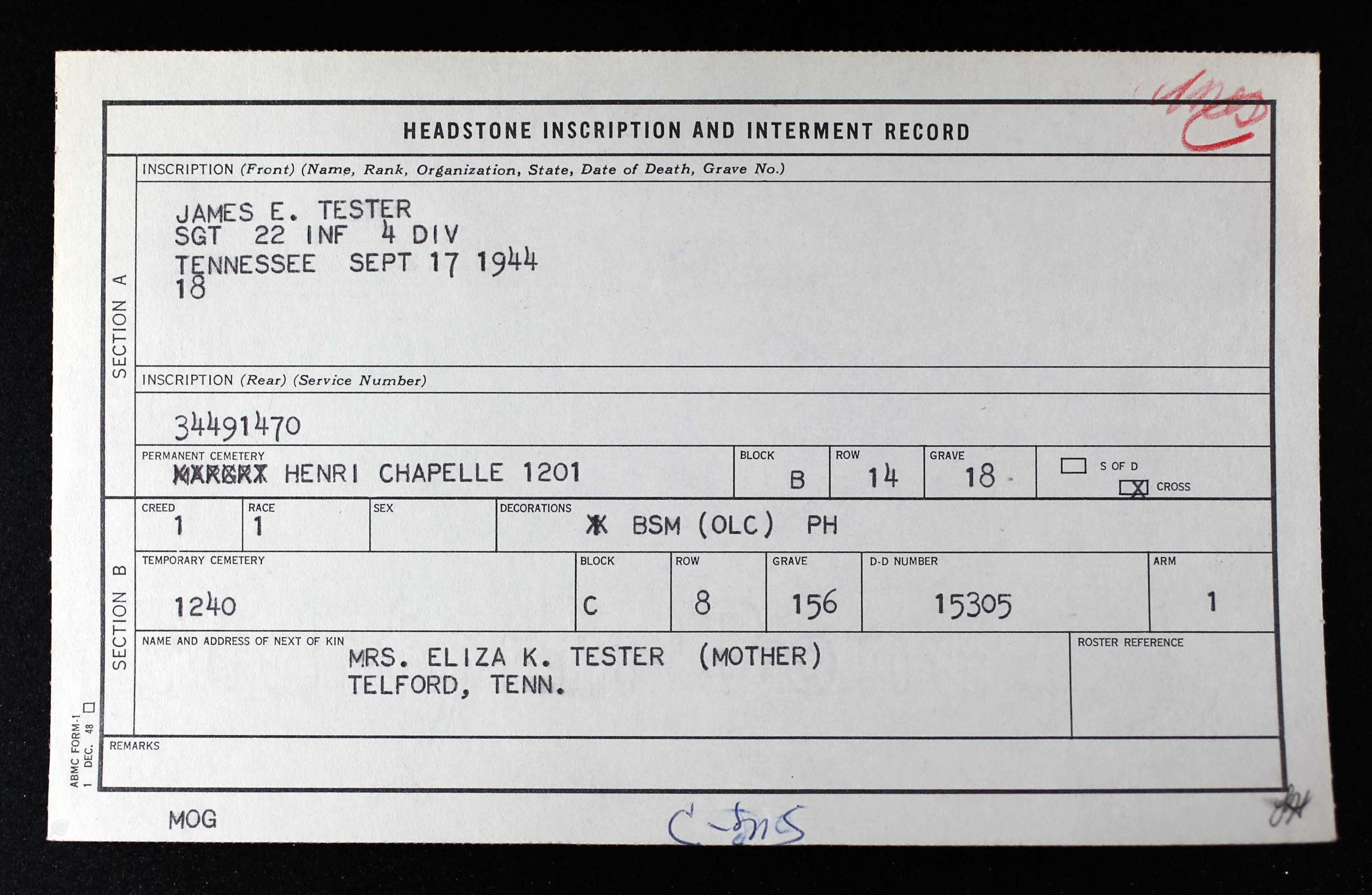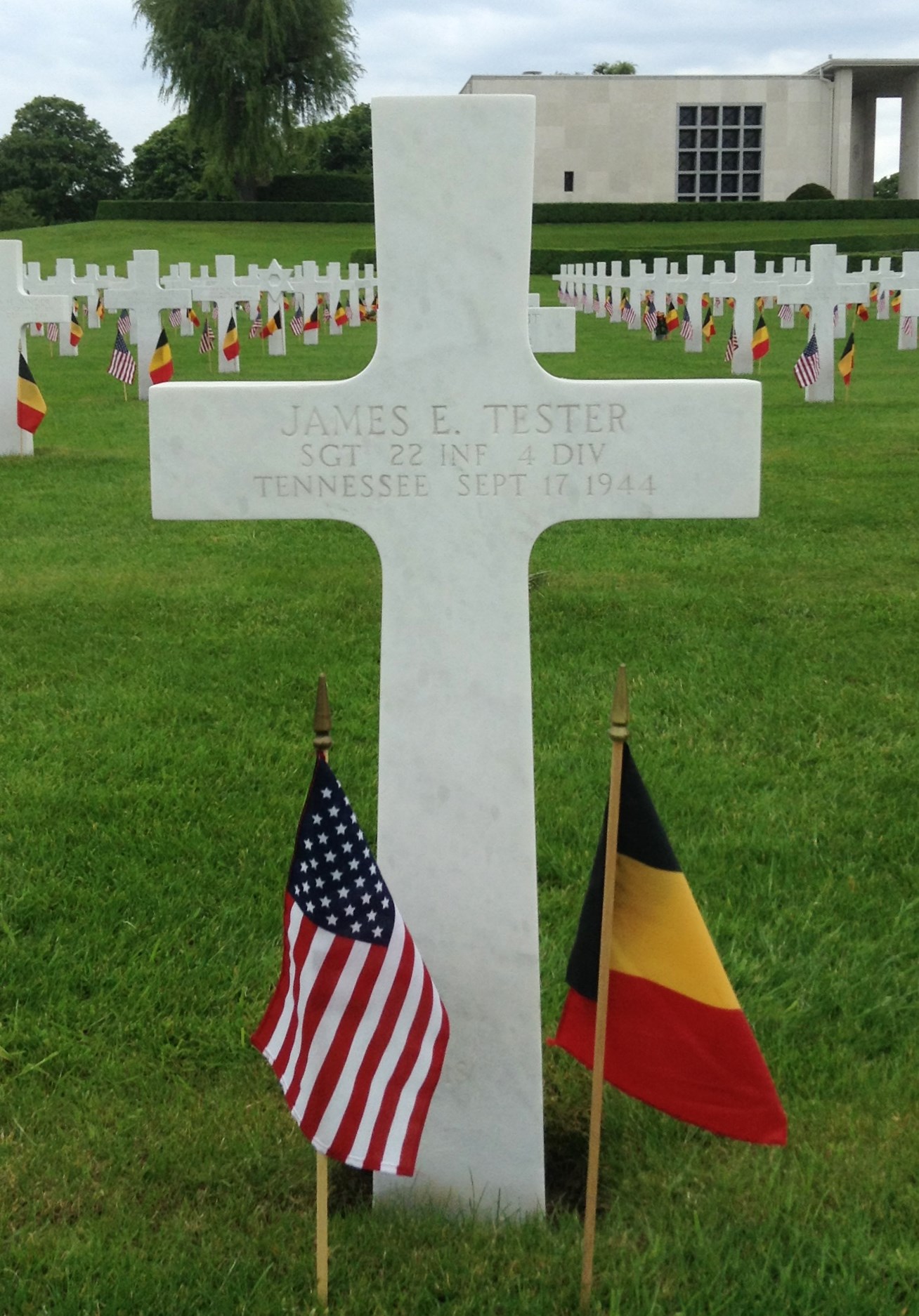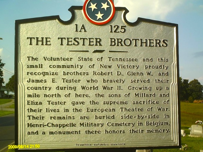 James Earle Tester, Glenn William Tester, and Robert Denton Tester are brothers and buried next to each other at Henri-Chapelle American Cemetery, Belgium. Robert is buried at B, 14, 18. The Tester brothers- Glenn W., James Earle and Robert Denton all have memorial markers in New Victory Baptist Church-Conklin Road and Telford-New Victory road in Telford, TN.