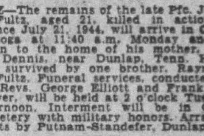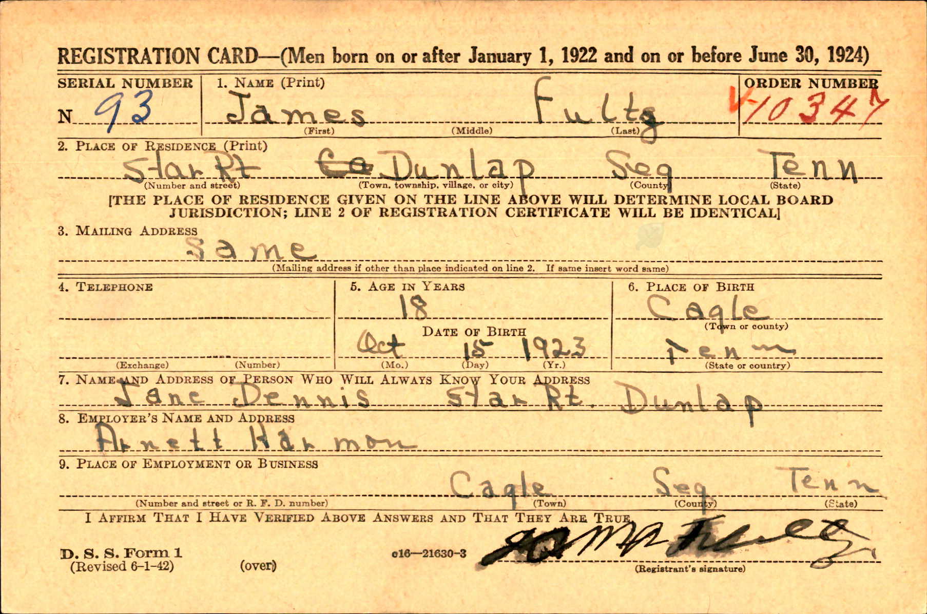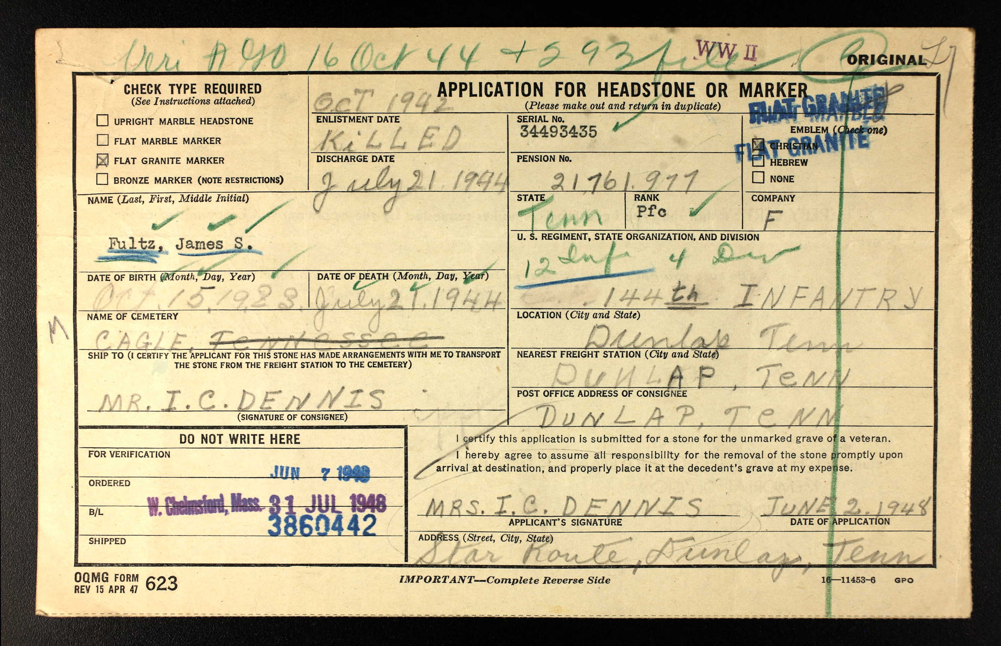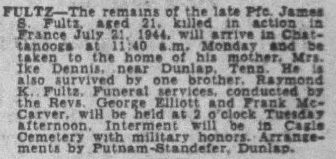 Private First Class James S. Fultz was born on 15 October 1923 in Cagle, Tennessee. He was the son of Isaac “Ike” Charles Dennis and Rebecca Jane Seals.