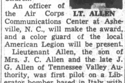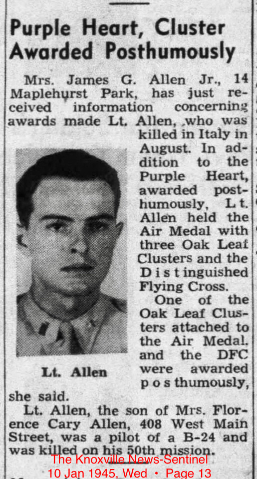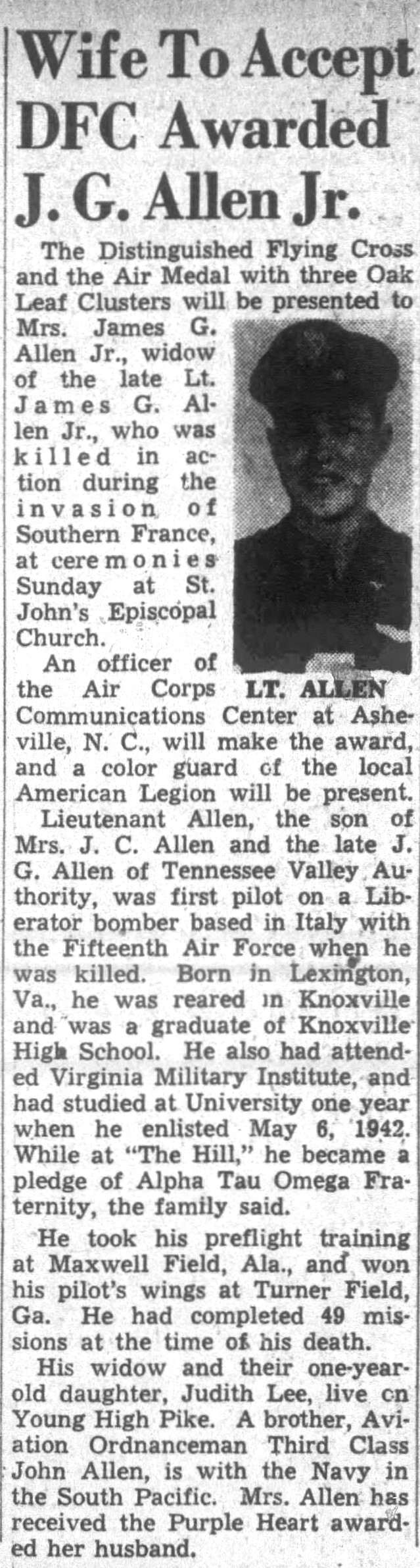 James Granville Allen was born in Lexington, Virginia, the son of James Granville Allen. He married Frances Lee Richard in February 1943 and they had a daughter, Judith Lee Allen. He Attended the Virginia Military Institute for one year in the class of 1944 until joining the U.S. Army Air Corps. Buried at the Sicily-Rome American Cemetery in Nettuno, Italy.