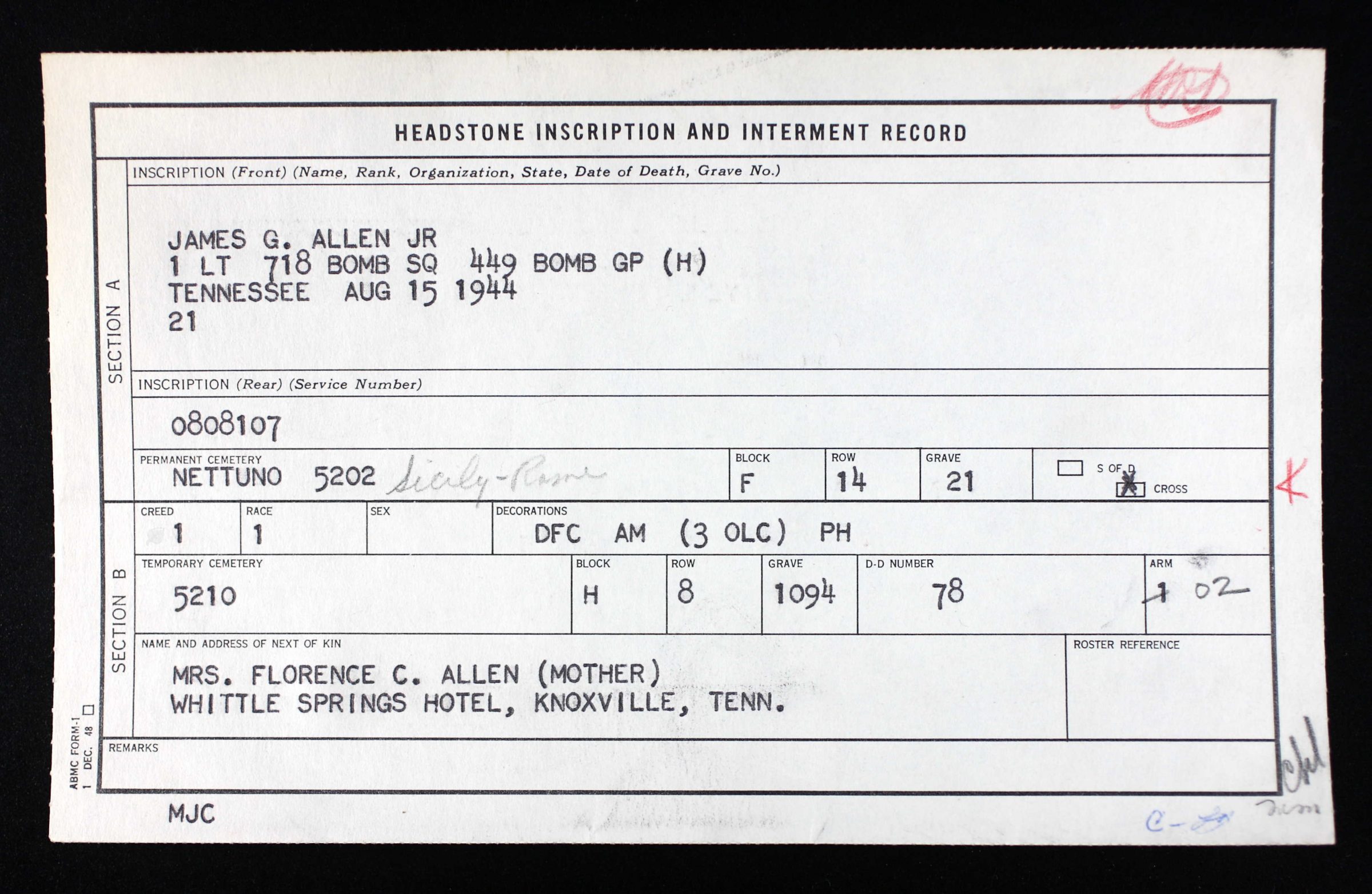 - Burial/Memorial Location: Sicily-Rome American Cemetery, Nettuno, Italy