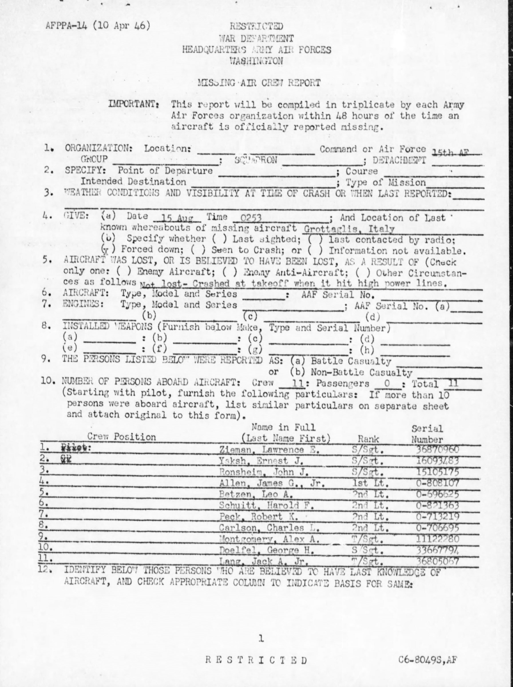 The aircraft crashed at takeoff when it hit high power lines and crashed to the ground burning immediately. This occurred 15 August at about 0253 approximately one half mile south of the airdrome at Grottaglie, Italy. All crew members were killed .