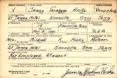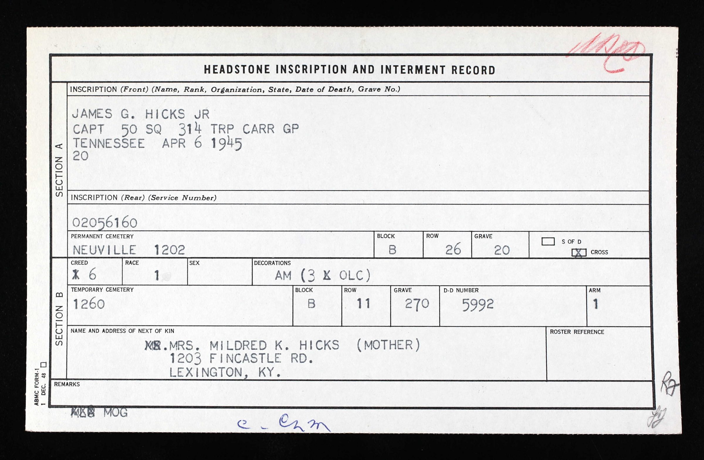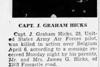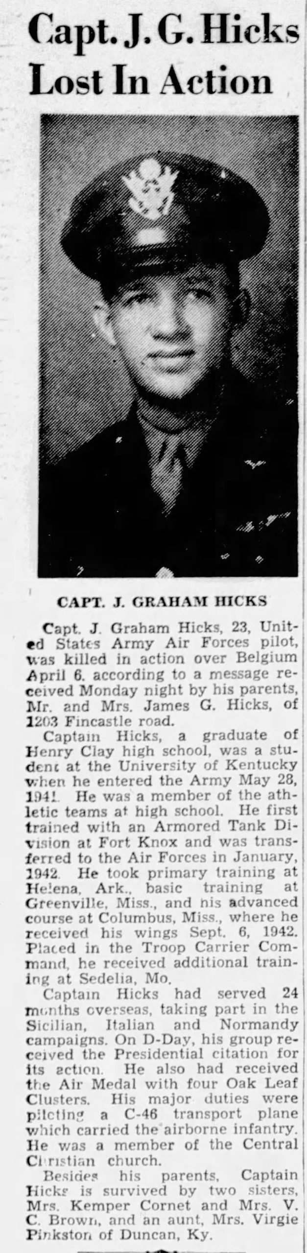 Capt J. Graham Hicks, 23, United States Army Air Forces pilot, was killed in action over Belgium, April , according to a message received Monday night by his parents, Mr. and James G. Hicks, of Fincastle road. Captain Hicks, a graduate of Henry Clay high school, was a student at the University of Kentucky when he entered the Army May 28, 1941. He was a member of the athletic teams at high school. He first trained with an Armored Tank Division at Fort Knox and was transferred to the Air Forces in January, 1942. He took primary training at Helena, Ark., basic training at Greenville, Miss., and his advanced course at Columbus, Miss, where he received his wings Sept. 6, 1942. Placed in the Troop Carrier Command, he received additional training at Sedelia, Mo. Captain Hicks had served 24 months overseas, taking part in the Sicilian, Italian and Normandy campaign. On D-Day, his group received the Presidential citation for its action. He also had received the Air Medal with four Oak Leaf Clusters. His major duties were pitching a C-46 transport plane which carried the airborne infantry. He was a member of the Central Christian church. Besides his parents, Captain Hicks is survived by two sisters, Mrs. Kemper Cornet and Mrs. V.C. Brown, and an aunt, Mrs. Virgie Pinkston of Duncan, Ky.