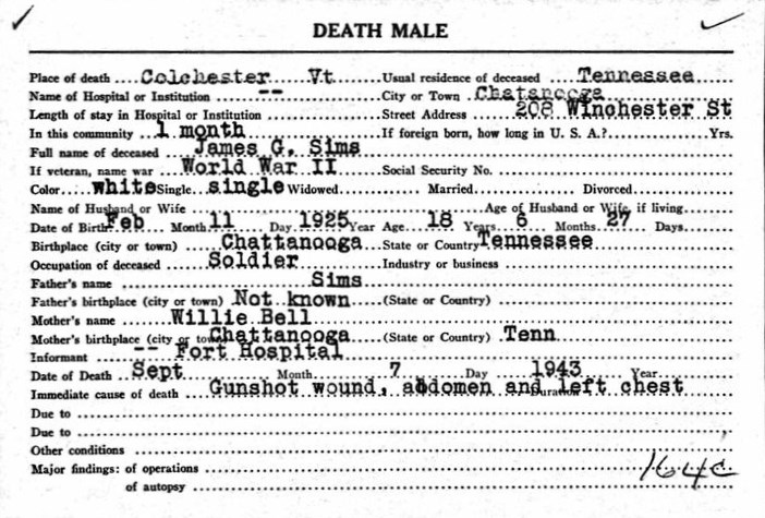 PVt Sims was stationed at Fort Ethan Allen in Vermont and died at Colchester, Chittenden, Vermont of a gunshot wounds, received accidentally at Fort Ethan Allen, Vermont at the age of 18.