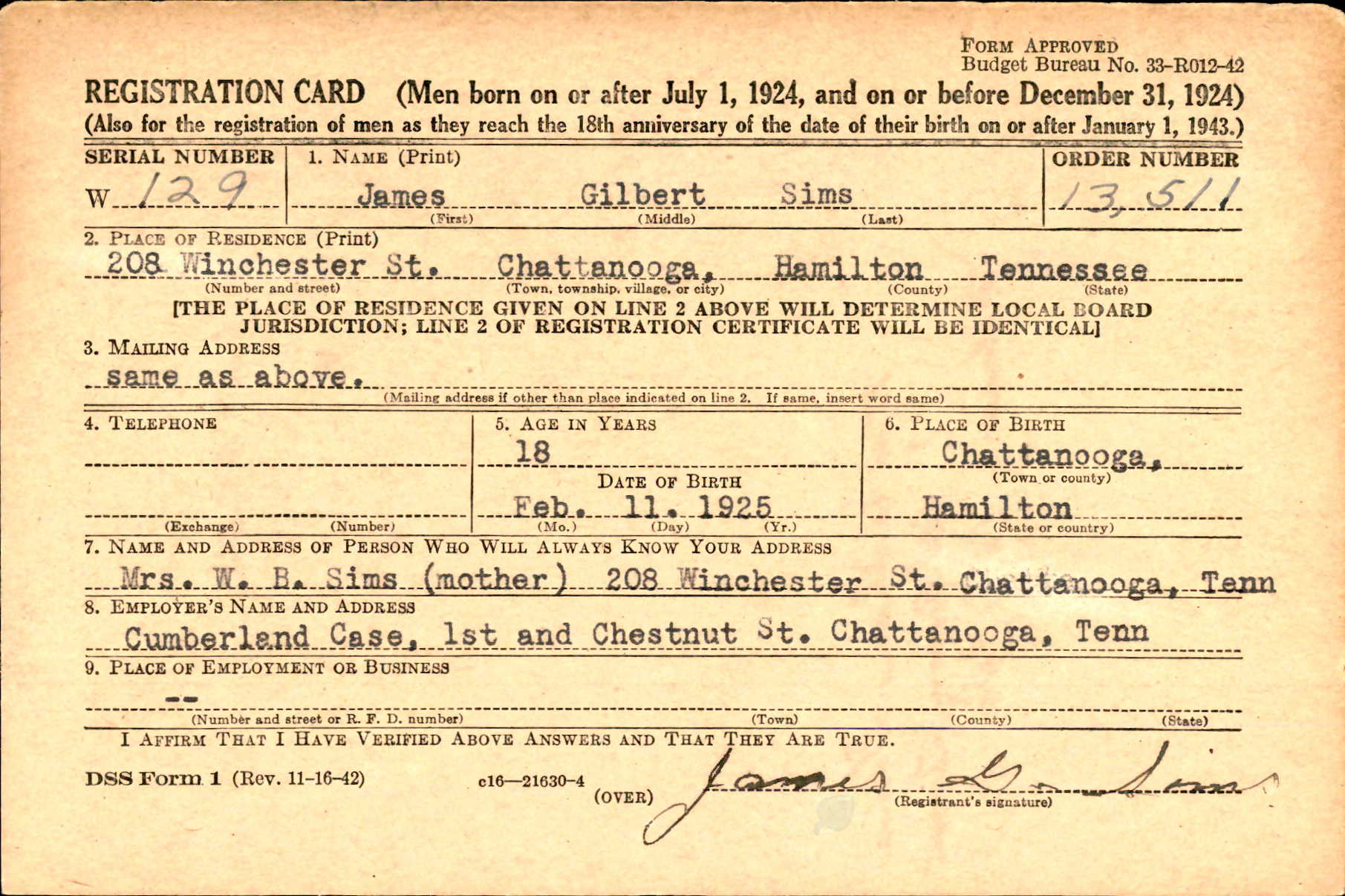 James Gilbert Sims was born at Chattanooga, Tennessee on 11 February 1925, the son of Benjamin Franklin Sims and Willie Belle Brewer.