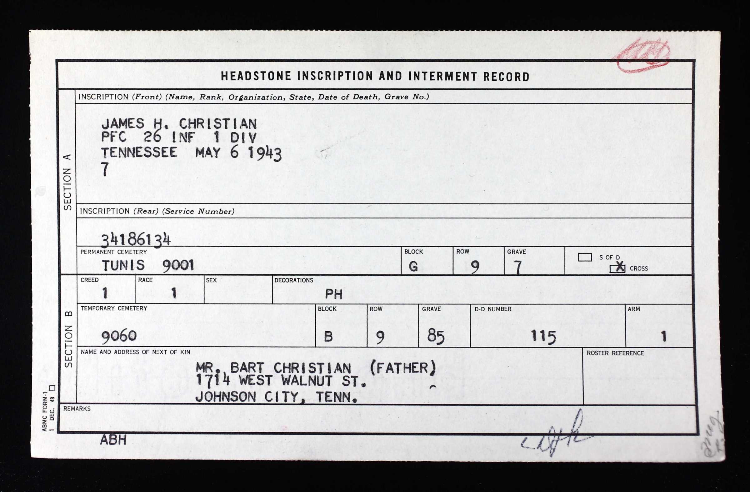 Private First Class James H. Christian was assigned to the 26th Infantry Regiment, 1st Infantry Division, The Big Red One.